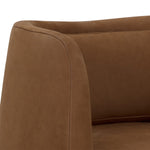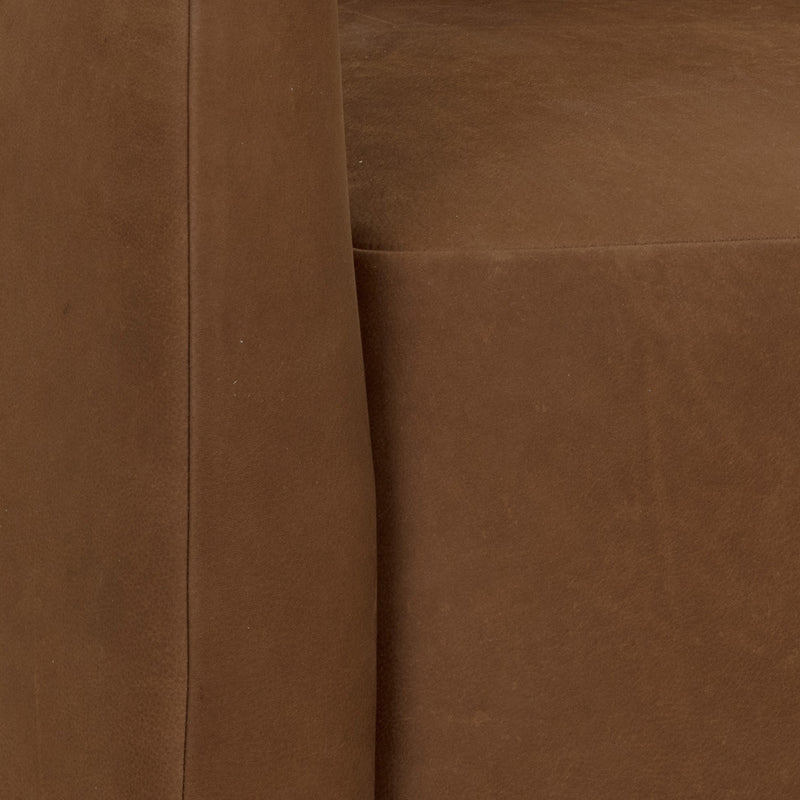 Experience ultimate comfort with the luxurious Emilie Swivel Lounge Chair. Features a well-defined rounded profile fully upholstered in nubuck caramel leather. A brown oak wood swivel base completes the look.