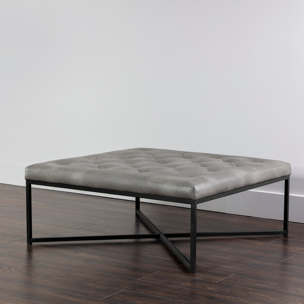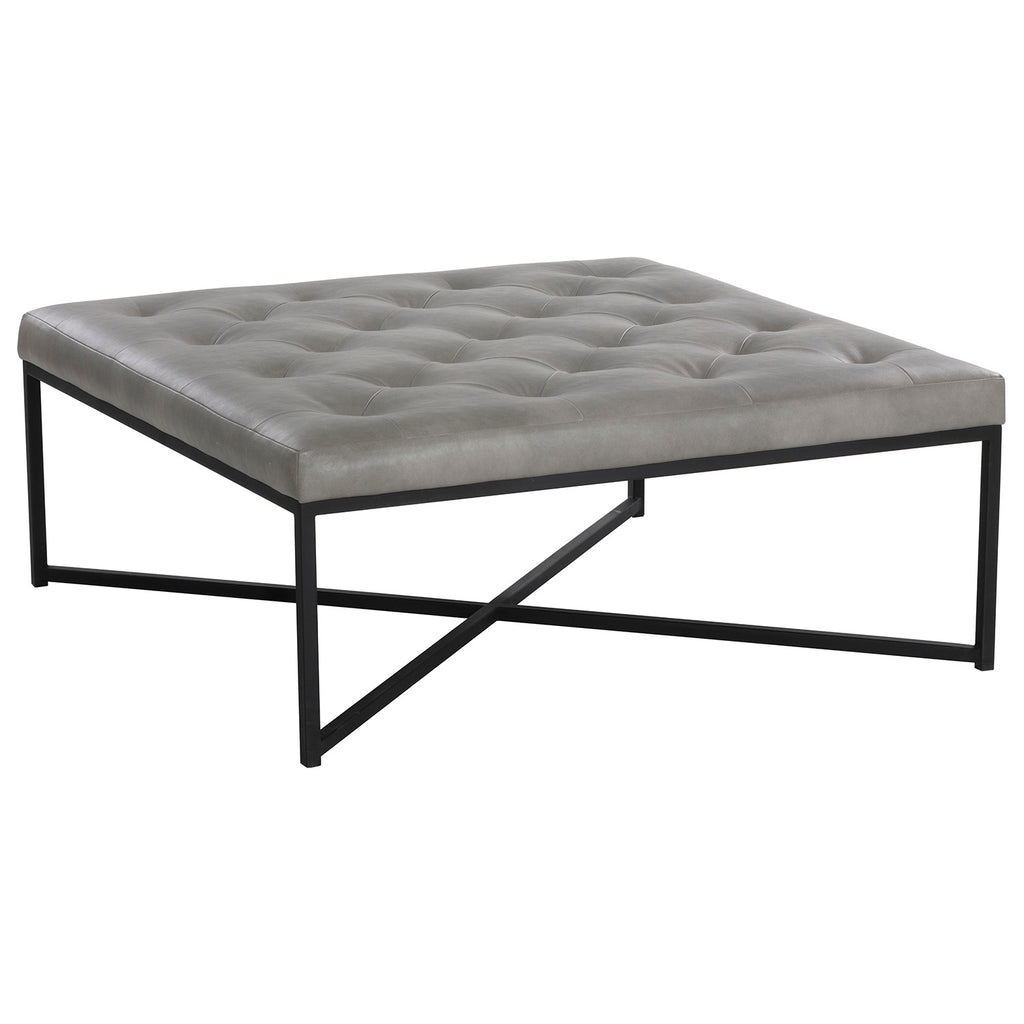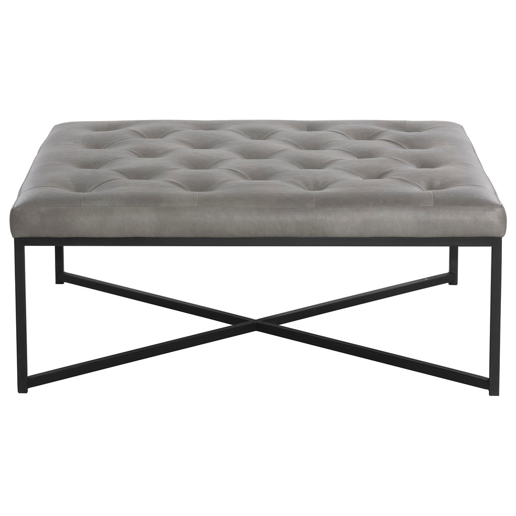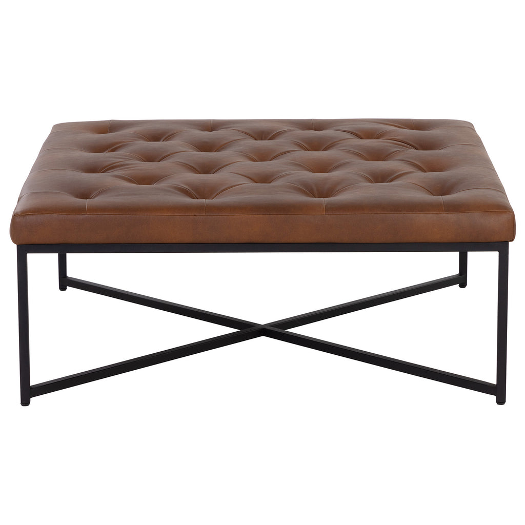 This large square ottoman exudes elegant and transitional flair. Features button tufting with an exposed x-base frame. Stocked in vintage black, camel, vanilla and peacock leather with an antique brass frame. Can be used as a coffee table or as extra seating in residential and commercial spaces.