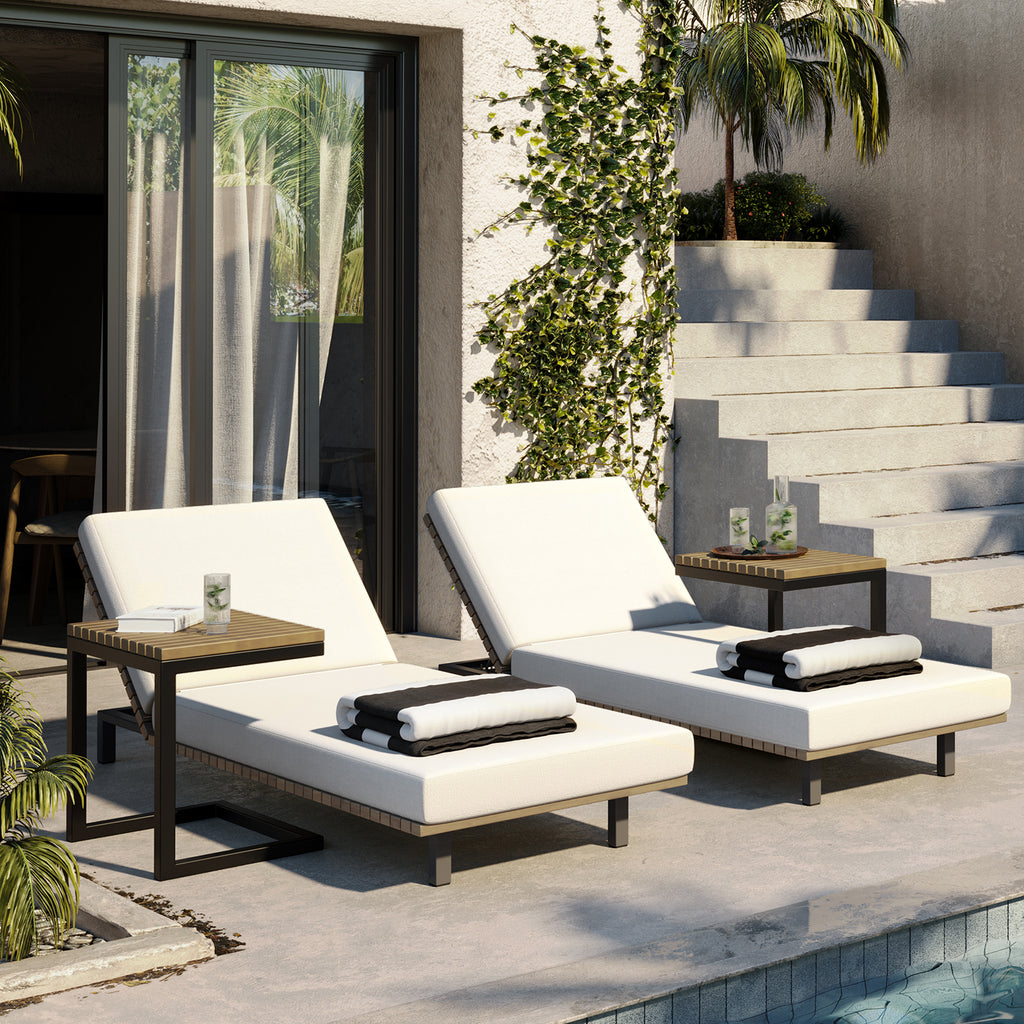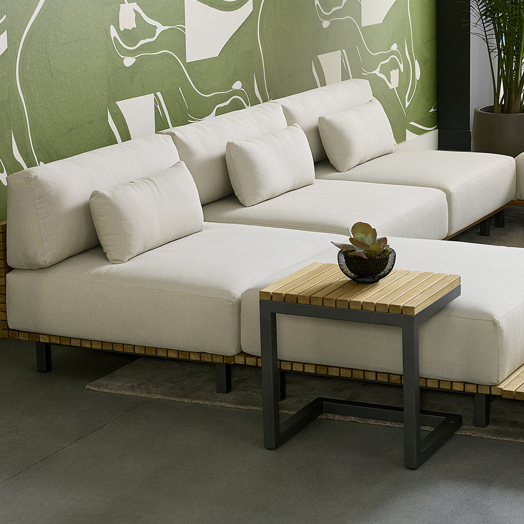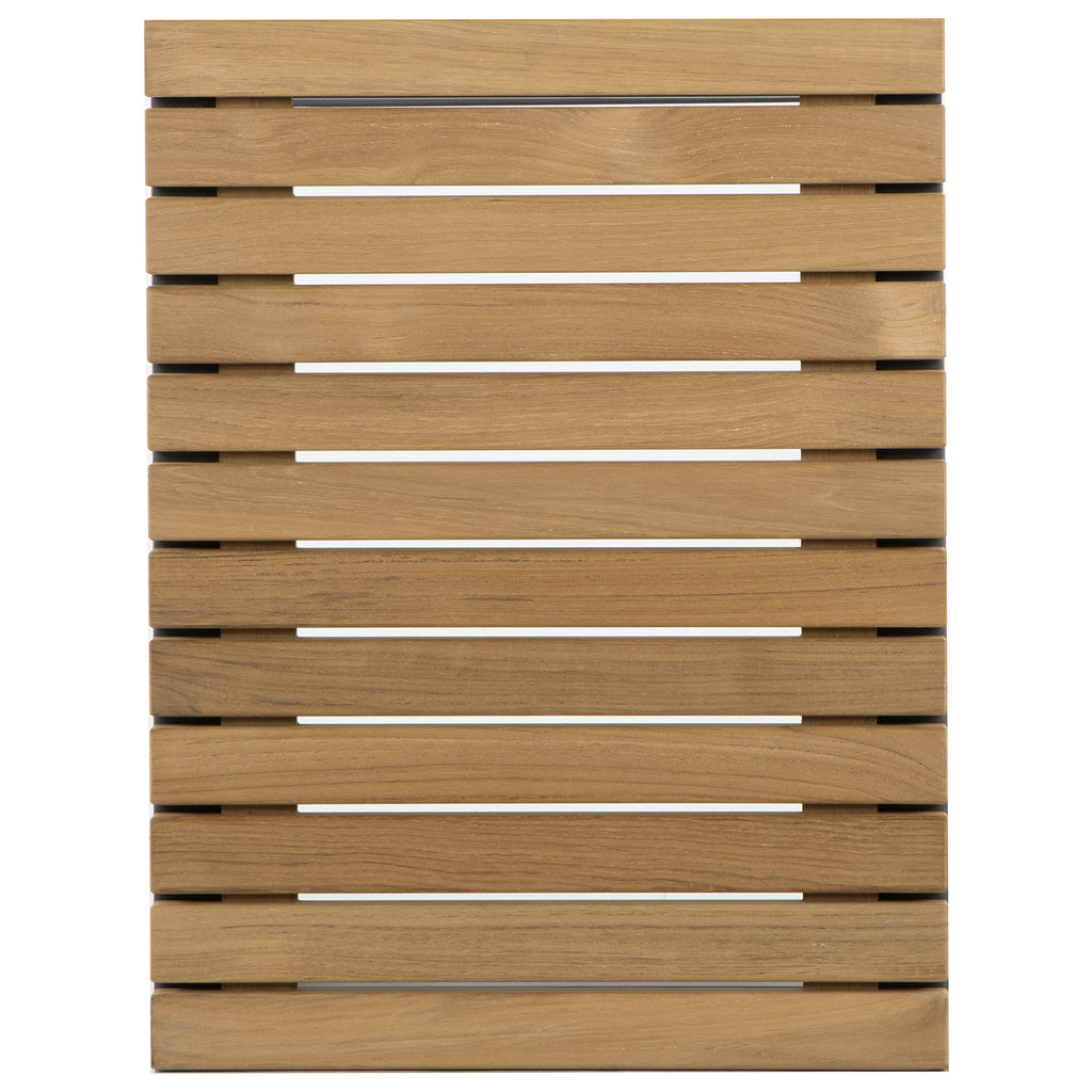 Appreciate warmth and sunlight while seated in an outdoor dining space inspired by the Arizona desert. This modern end table features a powder coated aluminum base with a natural teak wood top. Teak wood will develop a silver-grey finish over time.