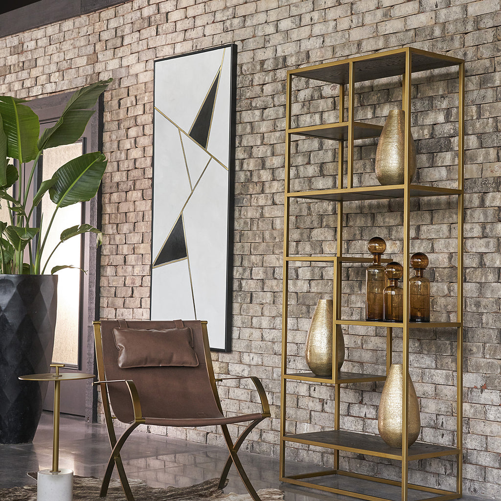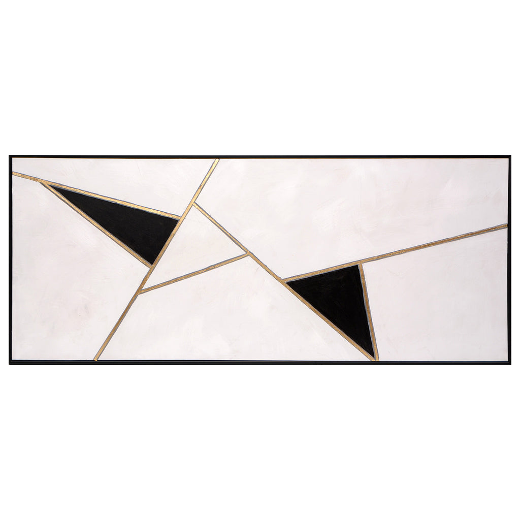 This contemporary painting features a lively, geometric design of white, black and gold paint. Features a black finished wood floater frame.