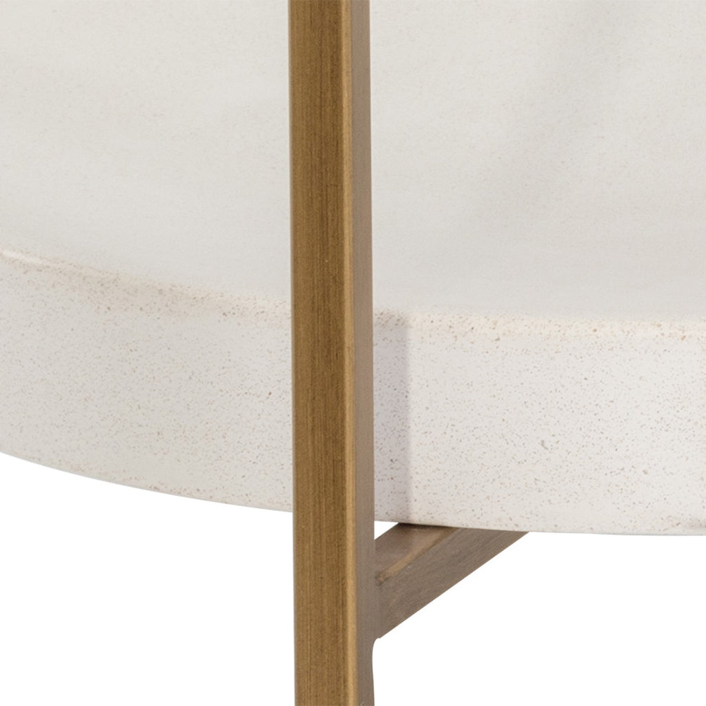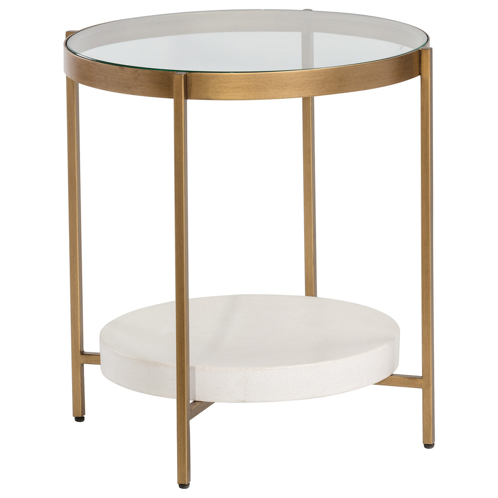 Incorporate an air of understated elegance into your designs with this end table. A beautiful round glass top and white Concrete shelf are supported by a brushed antique brass finished steel frame.