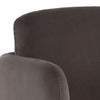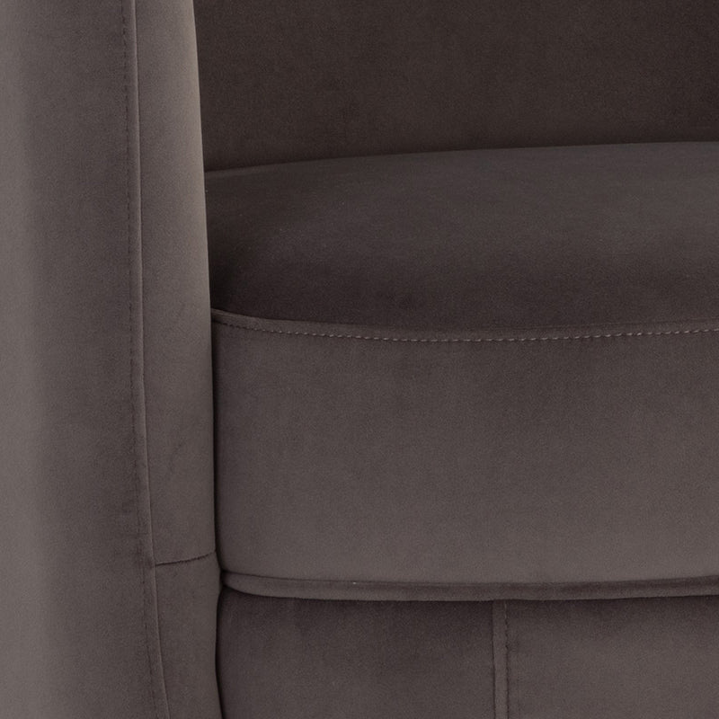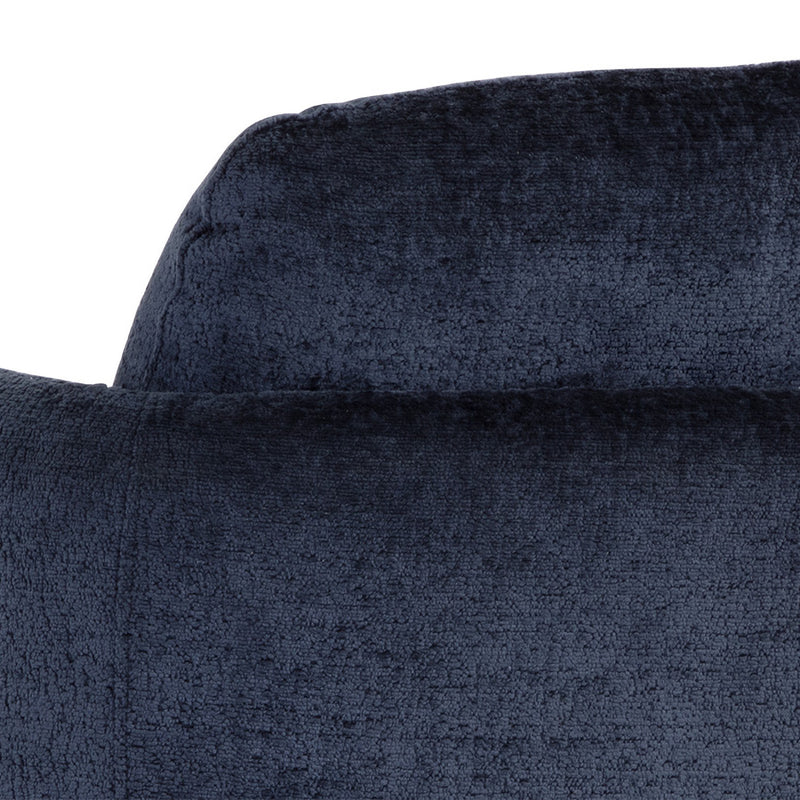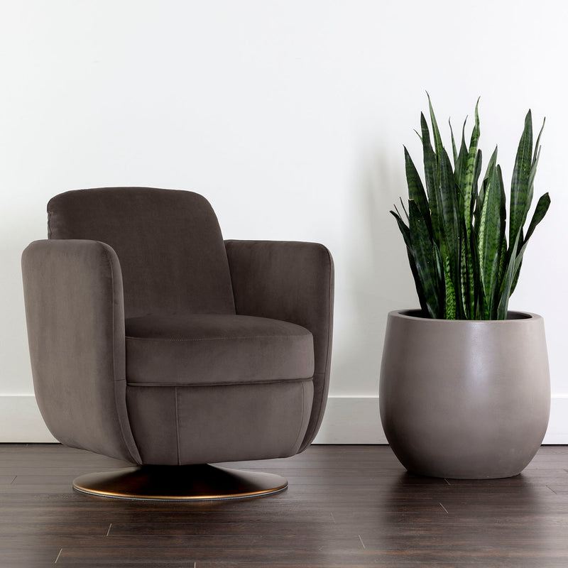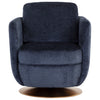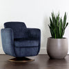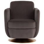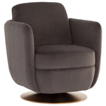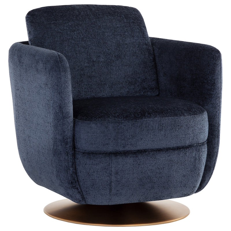 Add a compelling touch of contemporary style with this eye-catching swivel lounge chair. Stocked in bergen navy fabric and completed with a round, antique gold stainless steel base. Also available in meg ash fabric. Not available for sale in Canada.