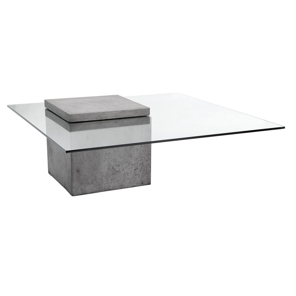 A bold concrete block defines this industrial modern coffee table. Features a contrasting 10mm tempered glass top embedded within the top of the base. A perfect complement to the design. Crafted from a natural concrete mix, each piece will look different