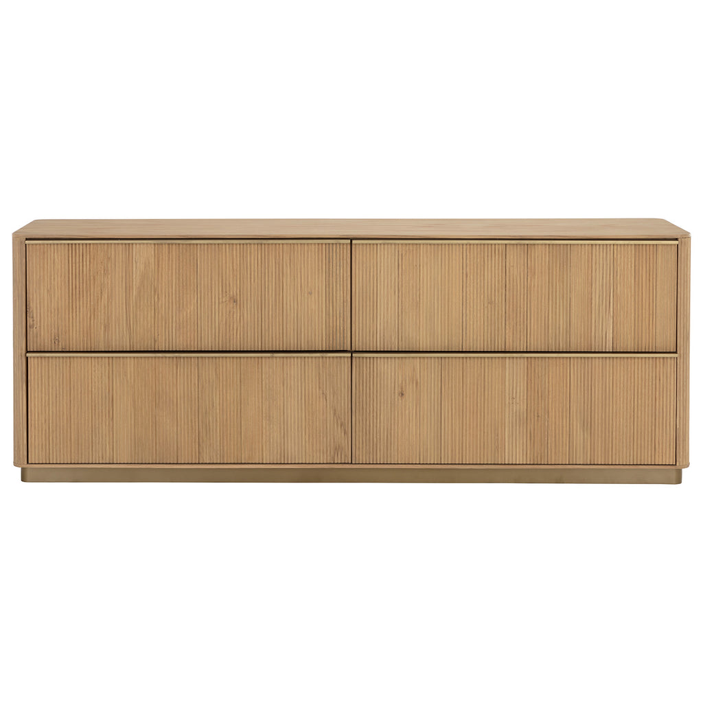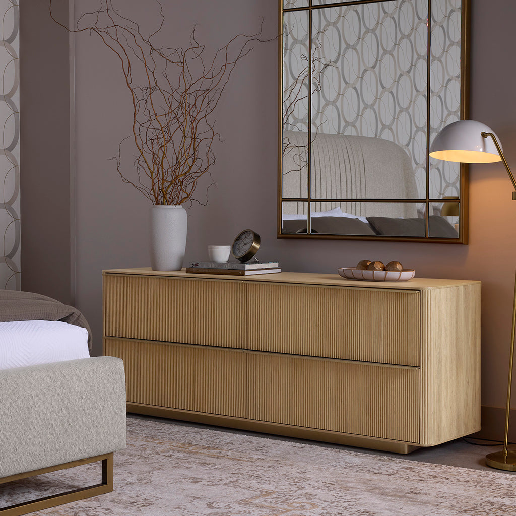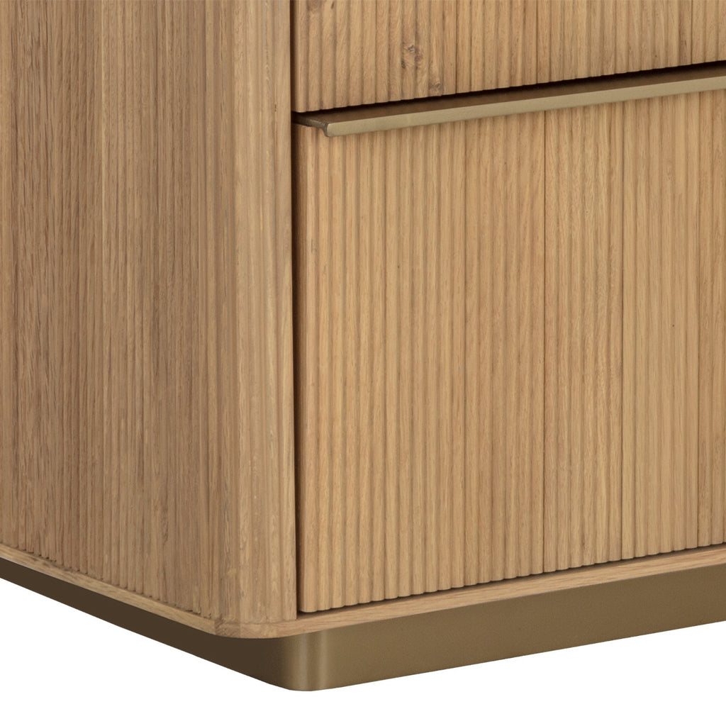 The Kalla Dresser brings form and function to life. Crafted with a rustic oak veneer with vertical reeding. A gold steel base finishes the look.