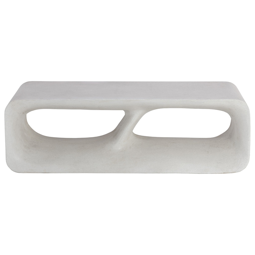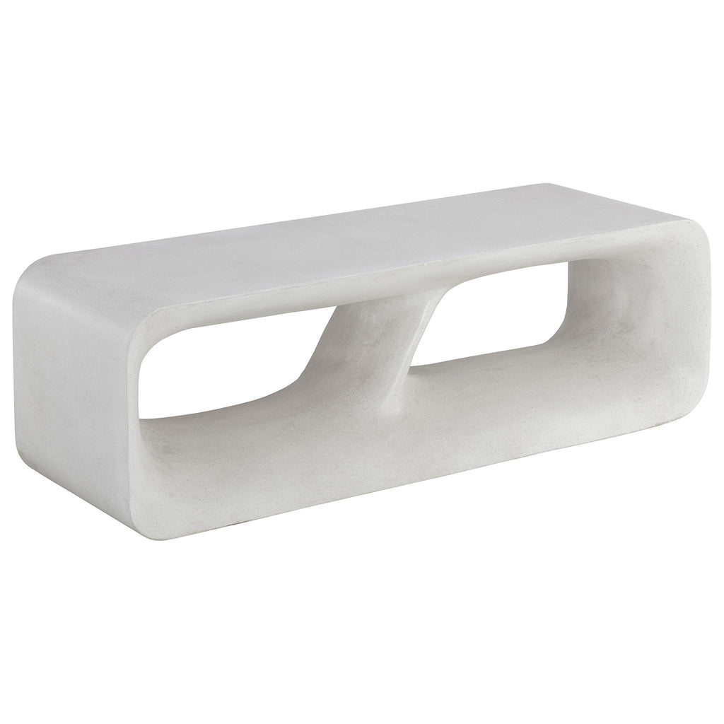 Smooth and polished edges define this contemporary bench that features an artistic design. Crafted from white concrete with a terrazzo finish. Suitable for indoor and outdoor covered spaces.