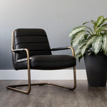 This retro-inspired lounge chair is perfect for lounge, living and office spaces. Handsomely designed with an exposed cantilever steel frame in a rustic bronze finish and horizontal channel tufting on the seat and seat back. Suitable for contract and residential environments.