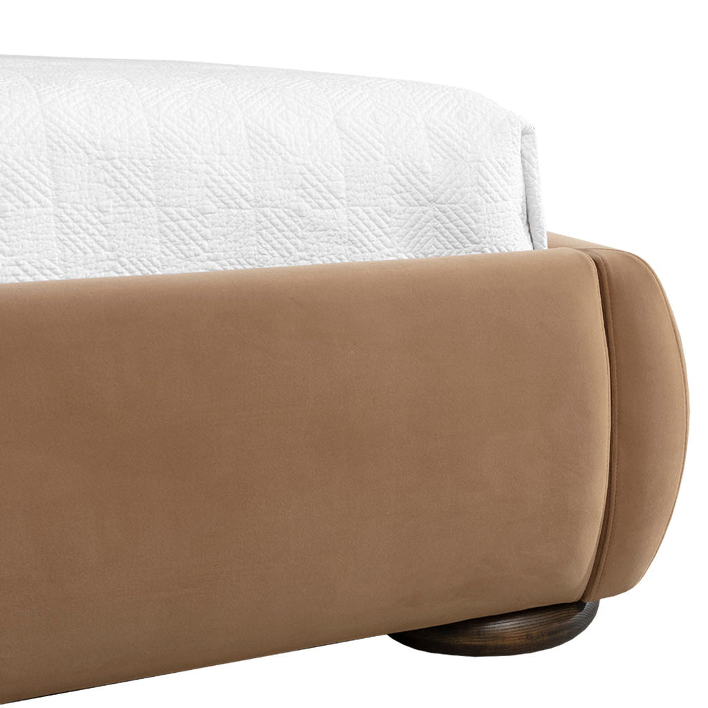 A visual embodiment of softness, the Marin Bed brings mesmerizing curves to the bedroom. Smooth to the touch with a well-padded headboard, this alluring bed is upholstered in velvety kona camel fabric with a low profile elevated on round solid oak wood legs.