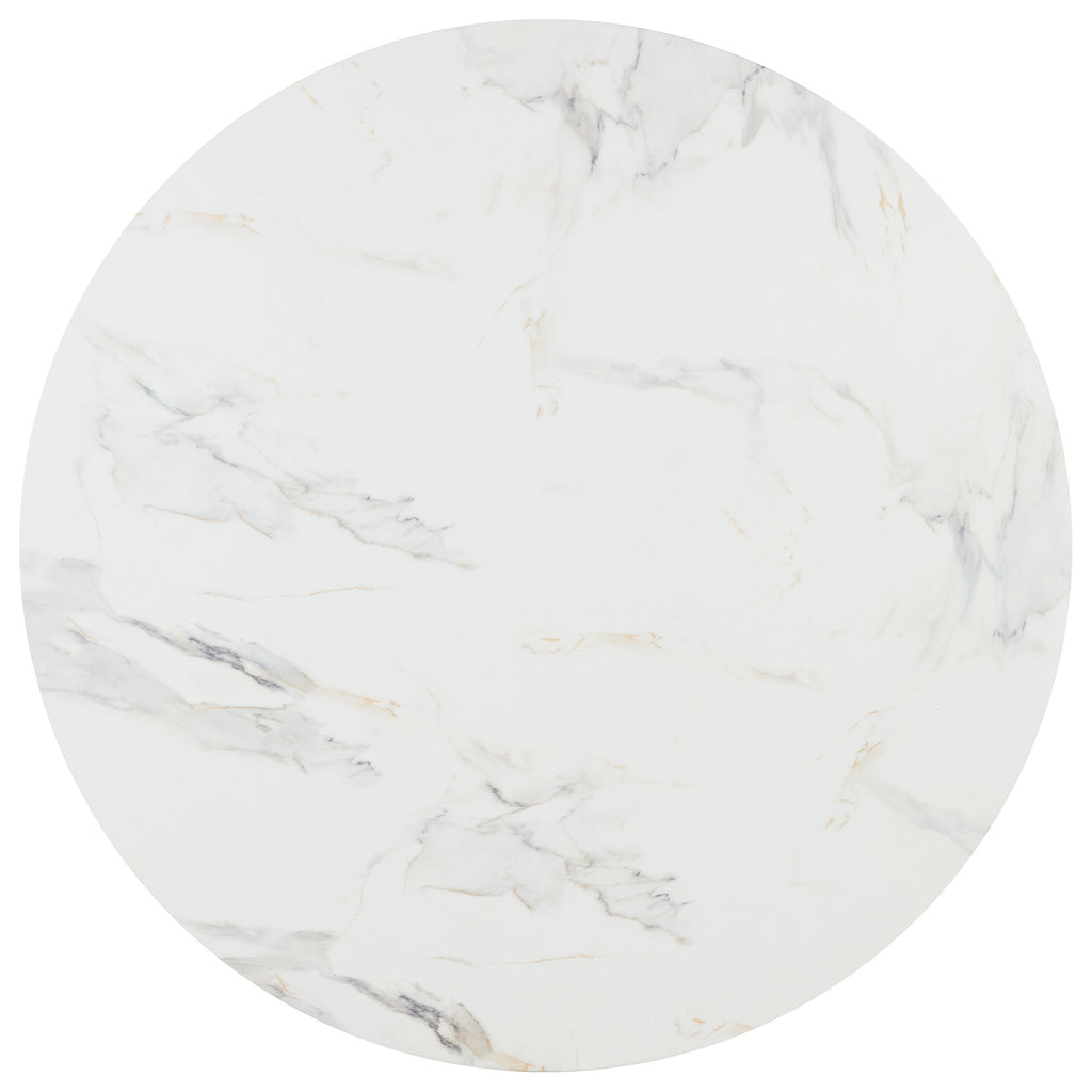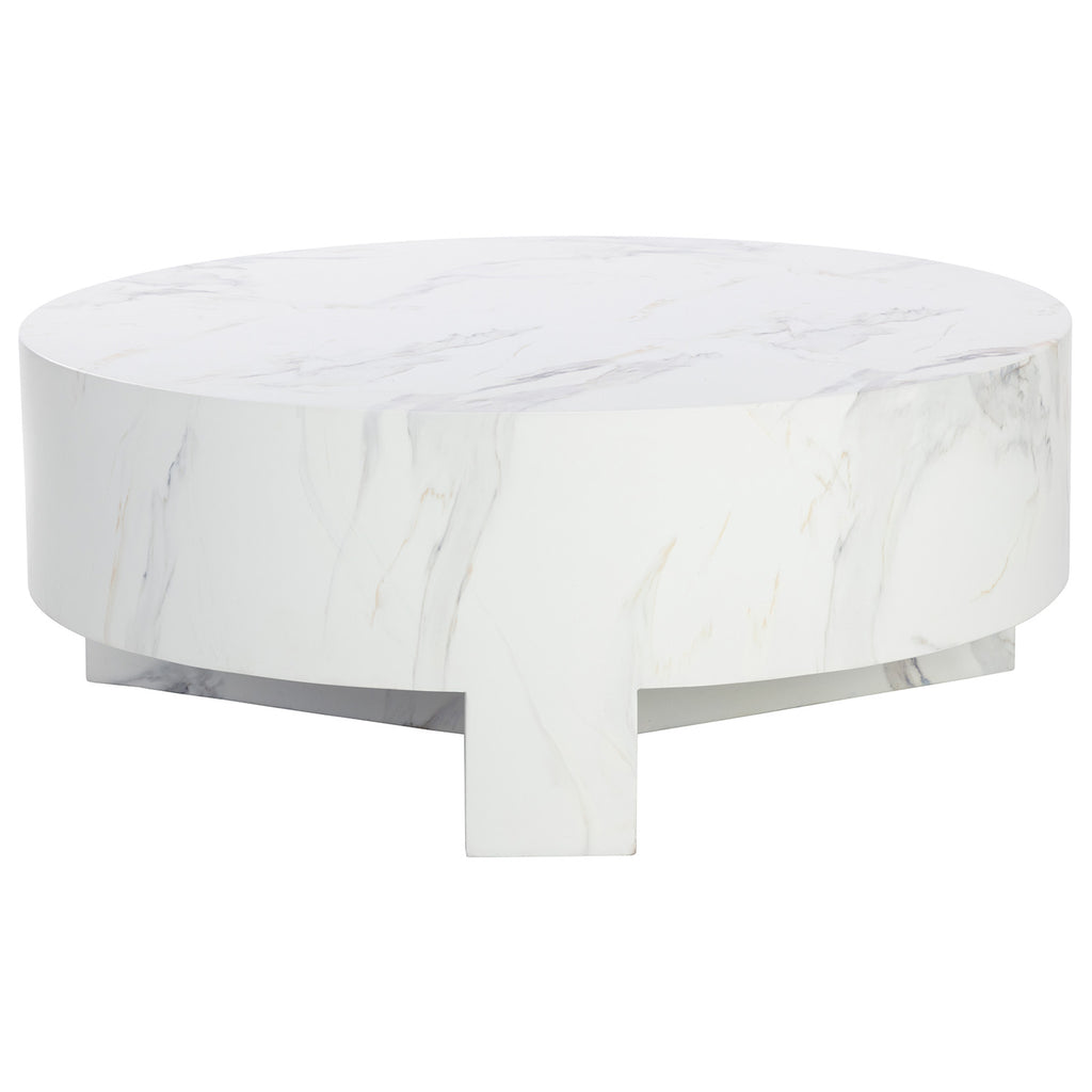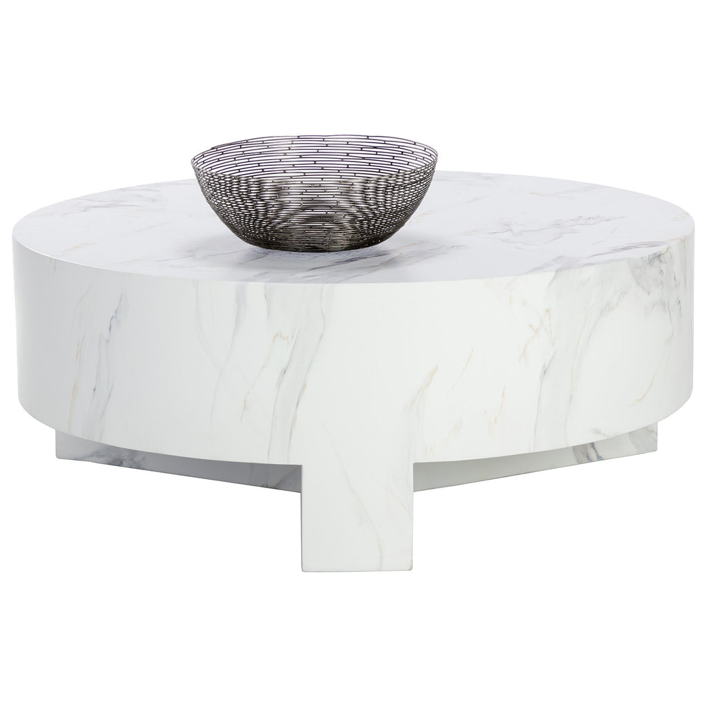 Infuse modern simplicity into any space with this alluring coffee table. Features a circular tabletop with a cutout base. Crafted from sealed concrete with a white Calacatta marble finish and its signature warm veining. Suitable for indoor and outdoor use. This marble finish can have unique veining, pitting, fissures, micro-cracks and colour variations that add to the uniqueness and beauty of each piece.
