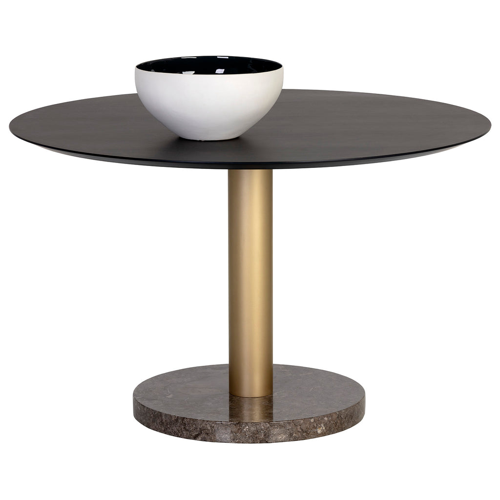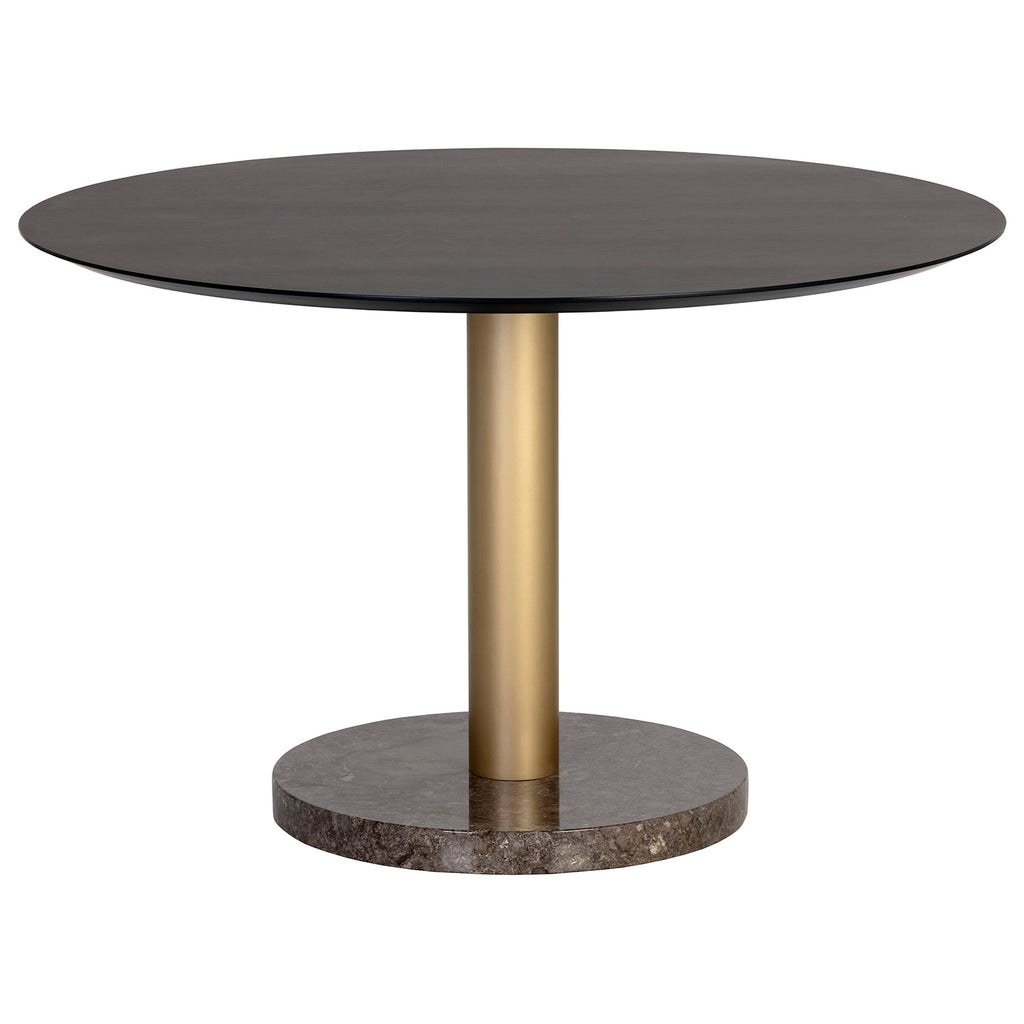 This dining table collection offers a modern look with an organic feel. Features a substantial light grey marble and brushed gold iron base with a charcoal grey finished oak wood veneer top.
