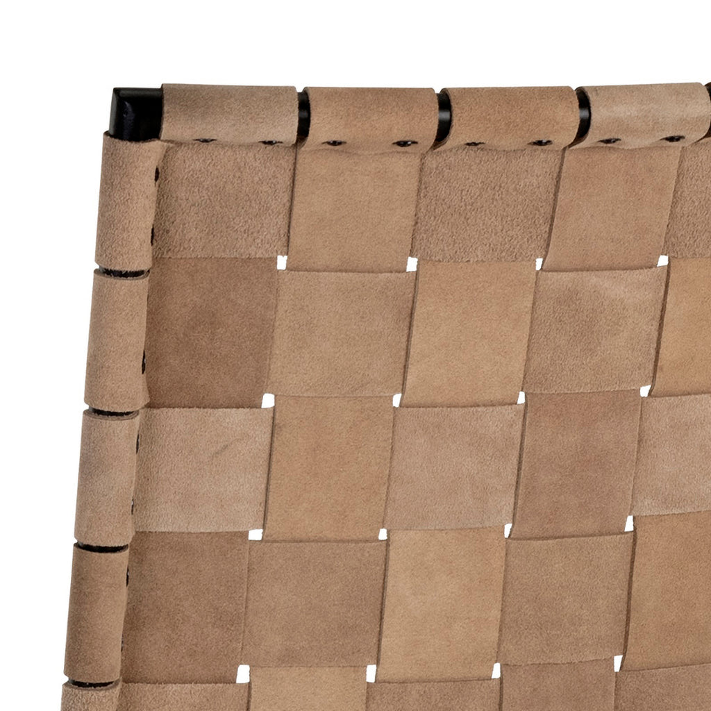 This elevated counter stool offers comfortable seating and unique style. Features a weaved seat in light black or tan suede leather and finished with a black iron frame.