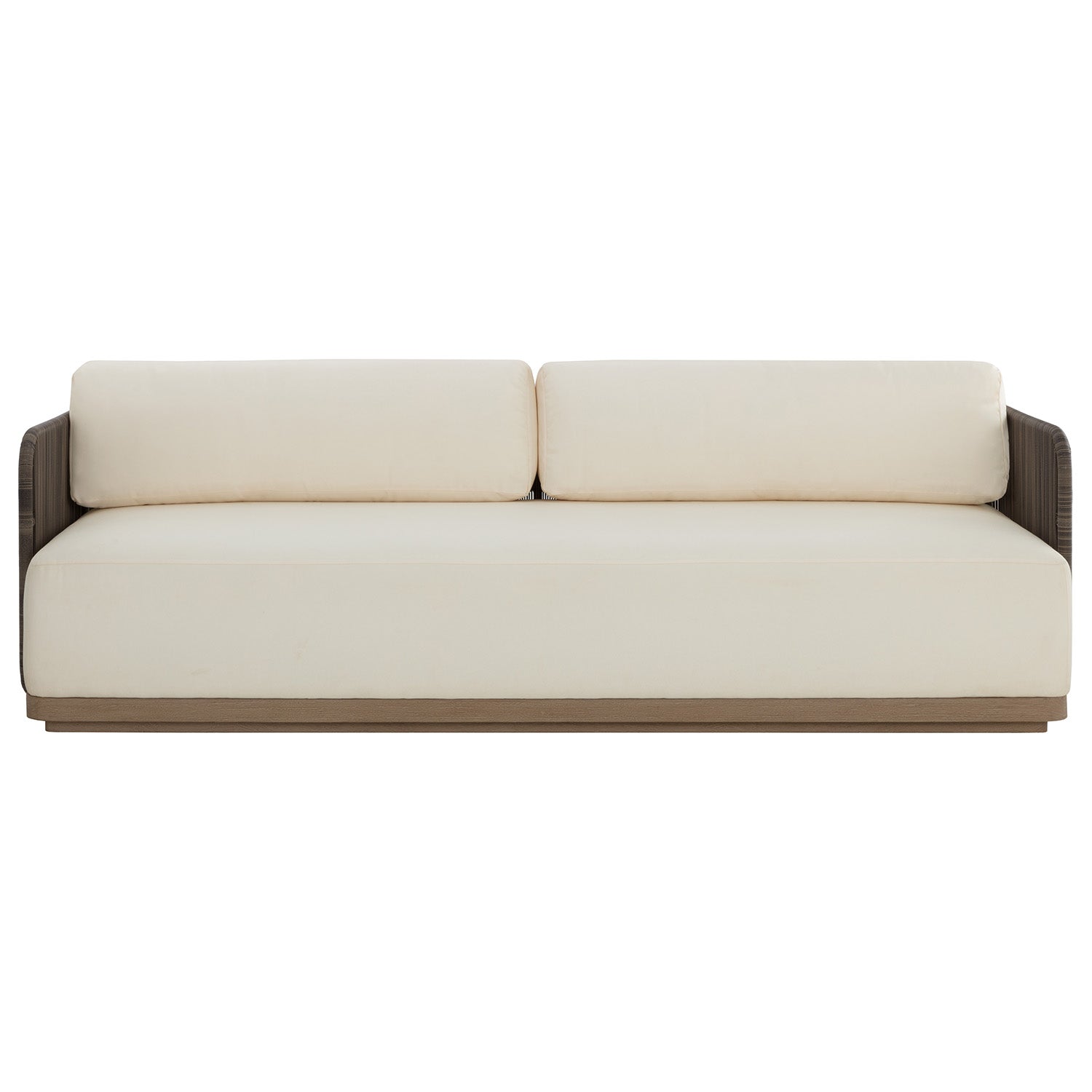 Relax and enjoy the weather with the comfortable Ravenna Sofa. Constructed with a drift brown teak wood base with a linear handwoven design made from ore gray polyrod on a black aluminum frame.