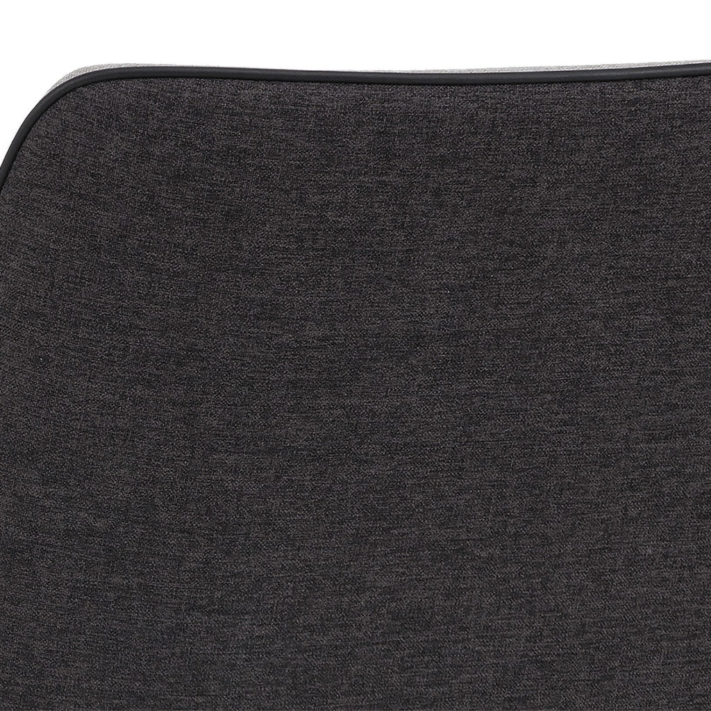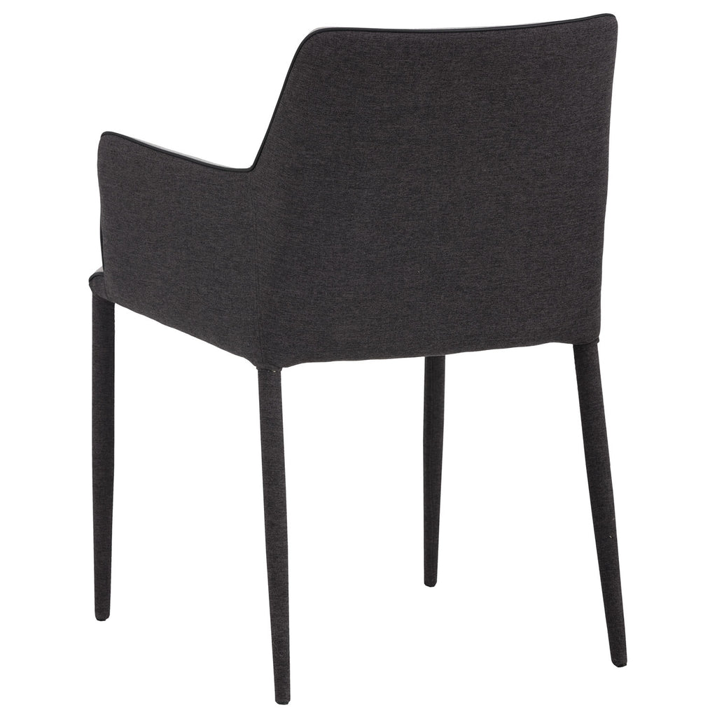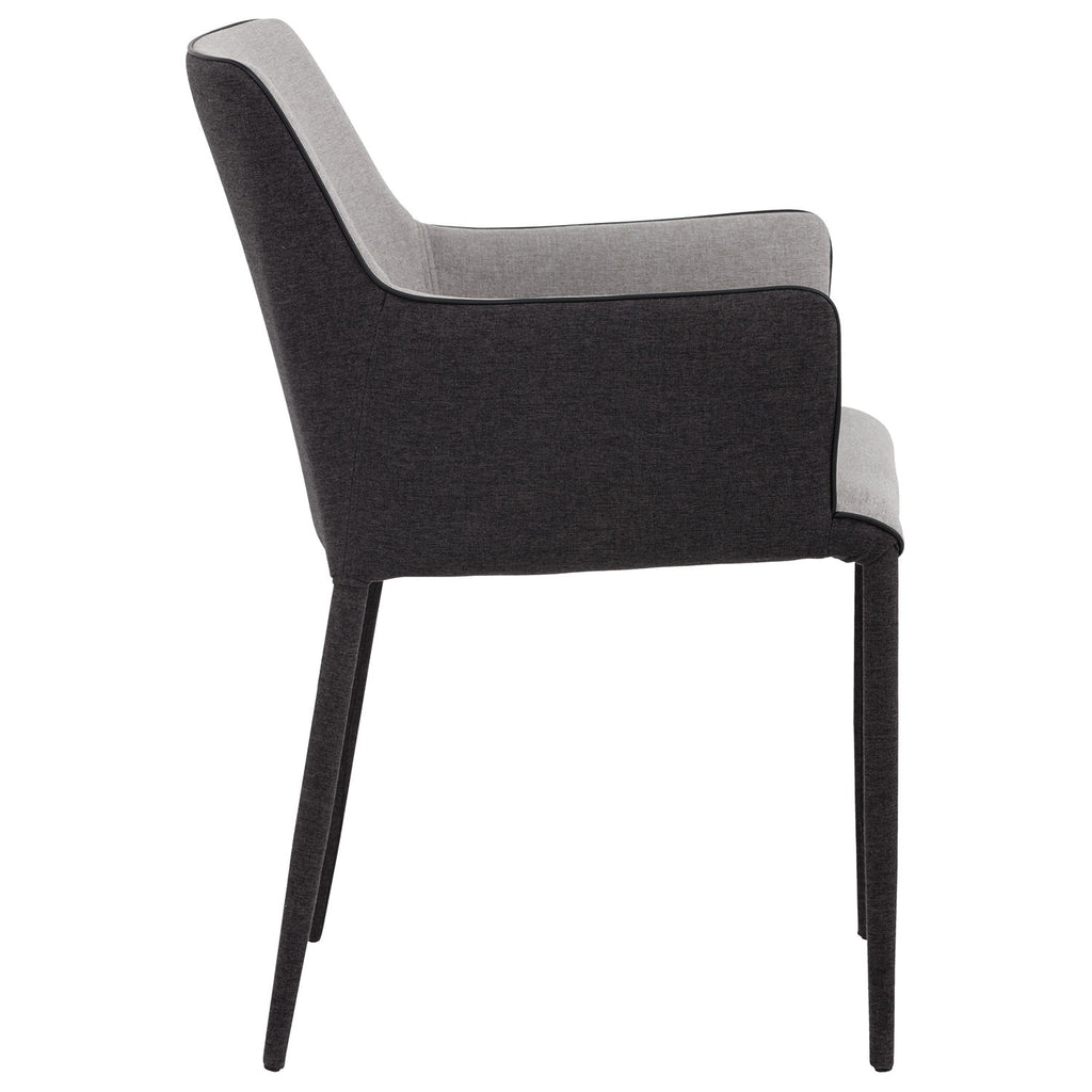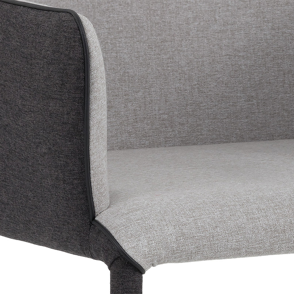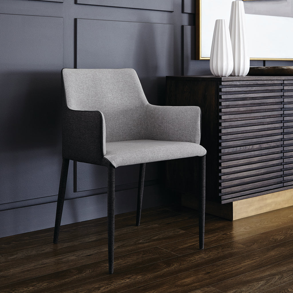 This modern dining armchair offers a minimalist silhouette perfect for small urban settings. Features a comfortable seat in armour gray fabric with a contrasting seat back and steel legs upholstered legs in dark slate fabric. Also available as a dining chair, barstool and counter stool.