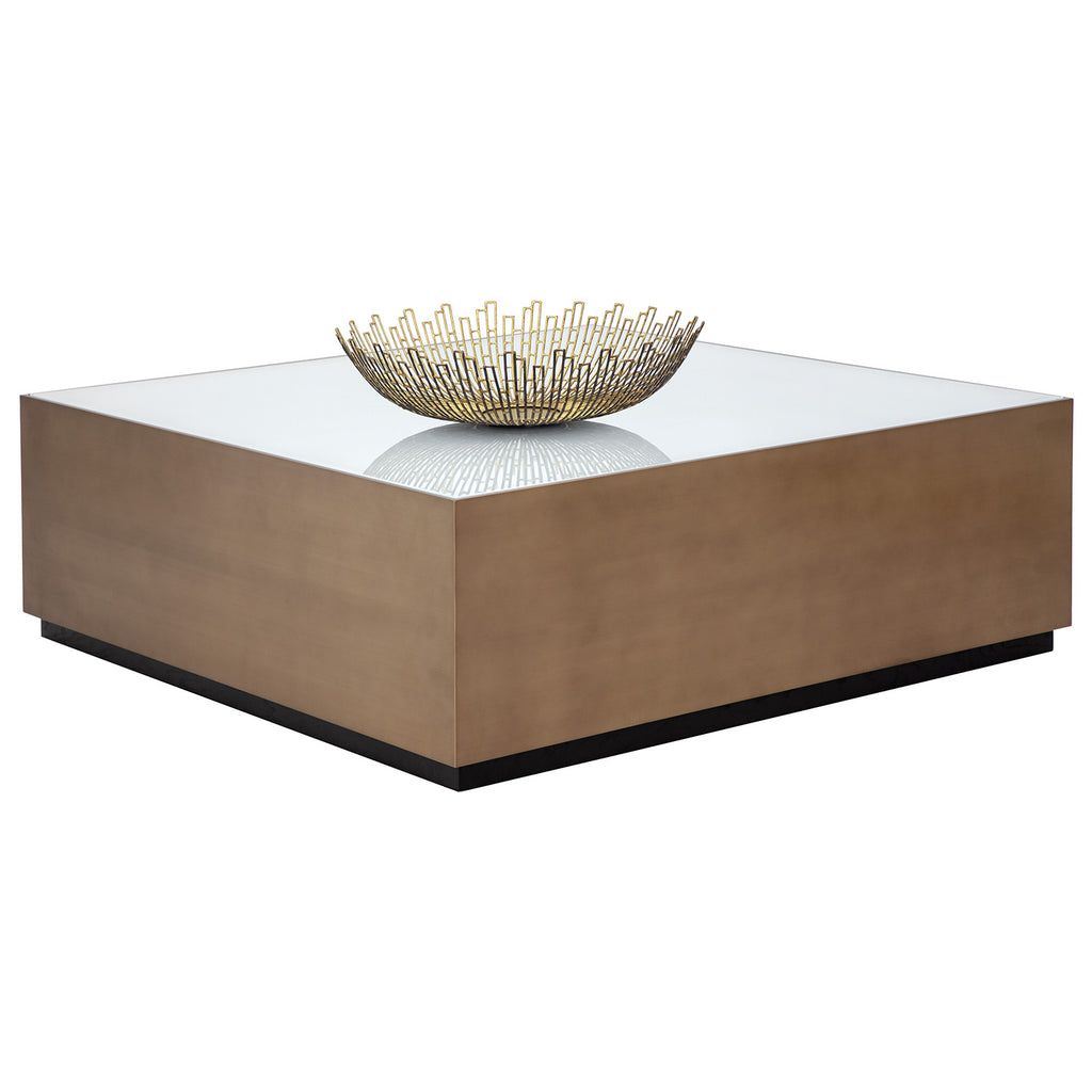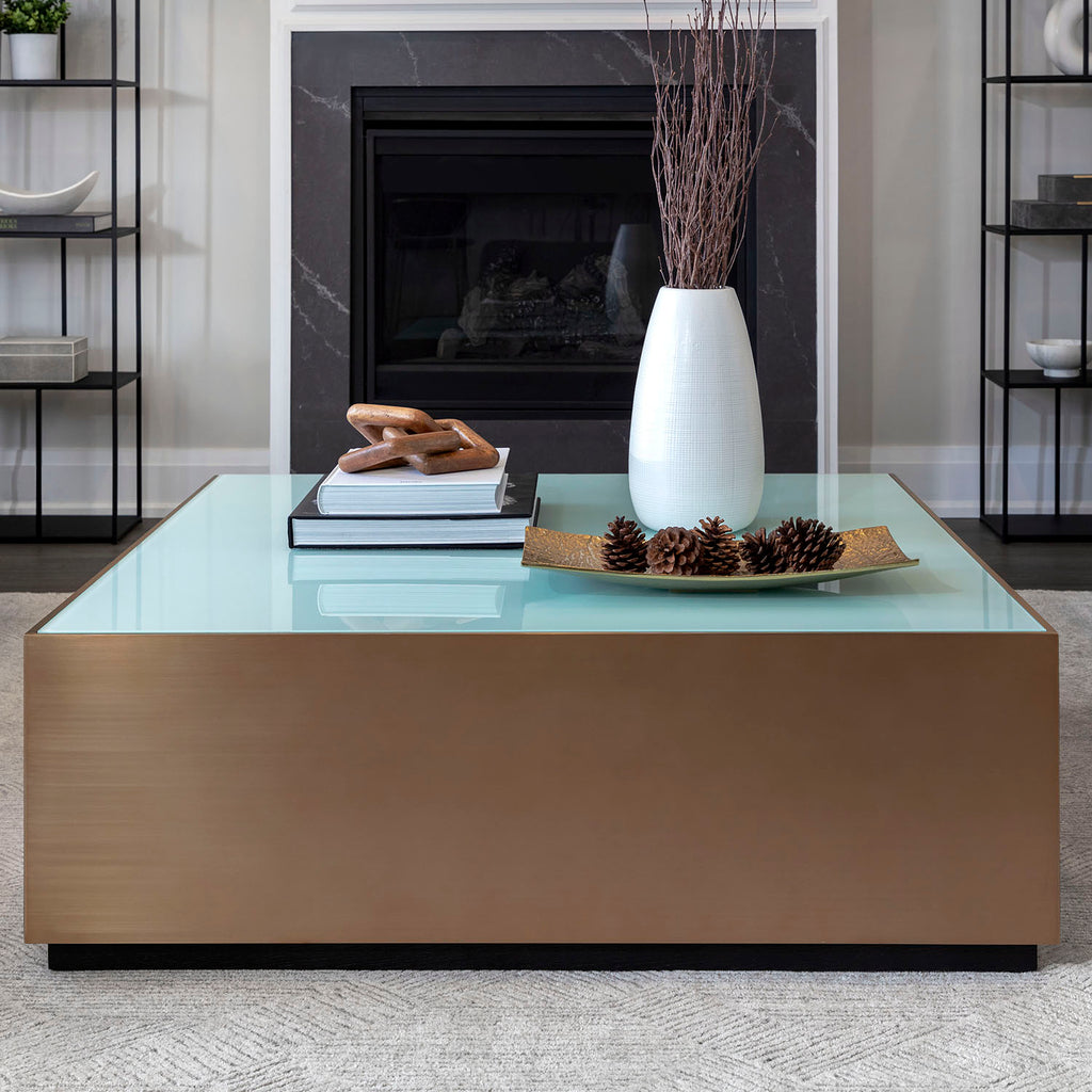 This large, stylish coffee table is elegant and modern. The unique white glass top is framed with a stunning brushed gold stainless steel frame and black oak wood base. Suitable for commercial and residential environments.