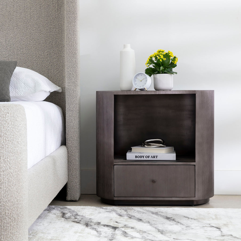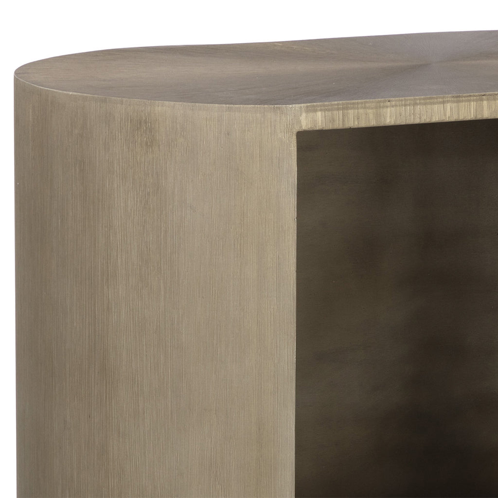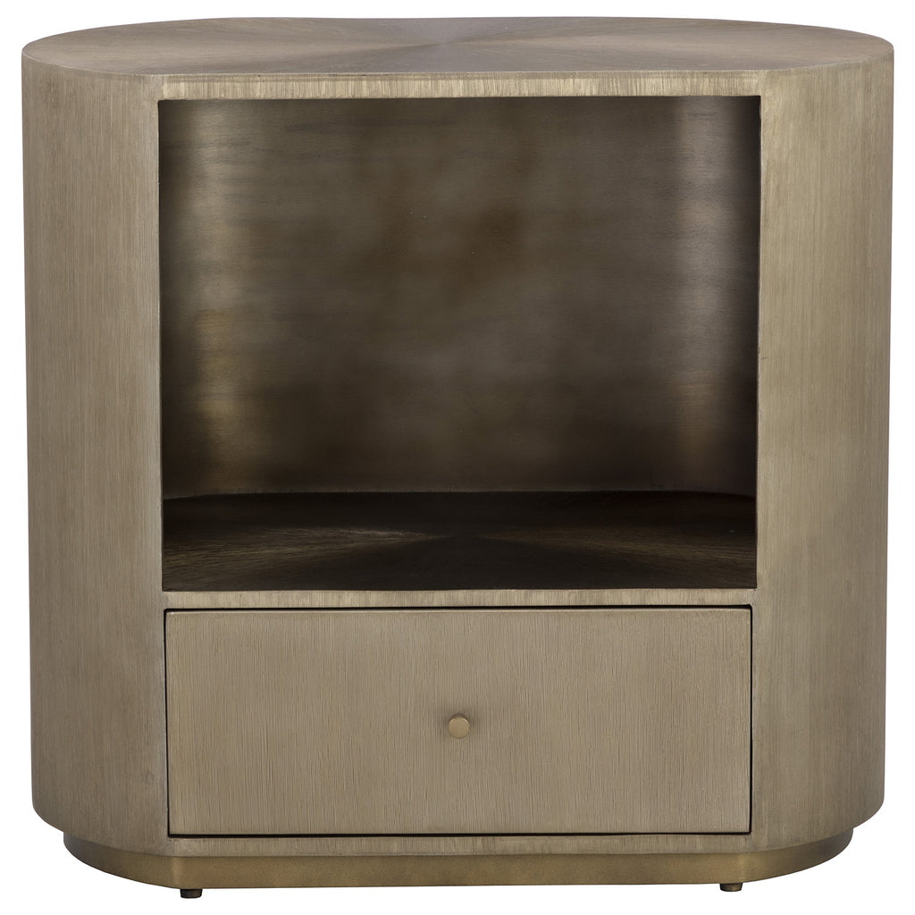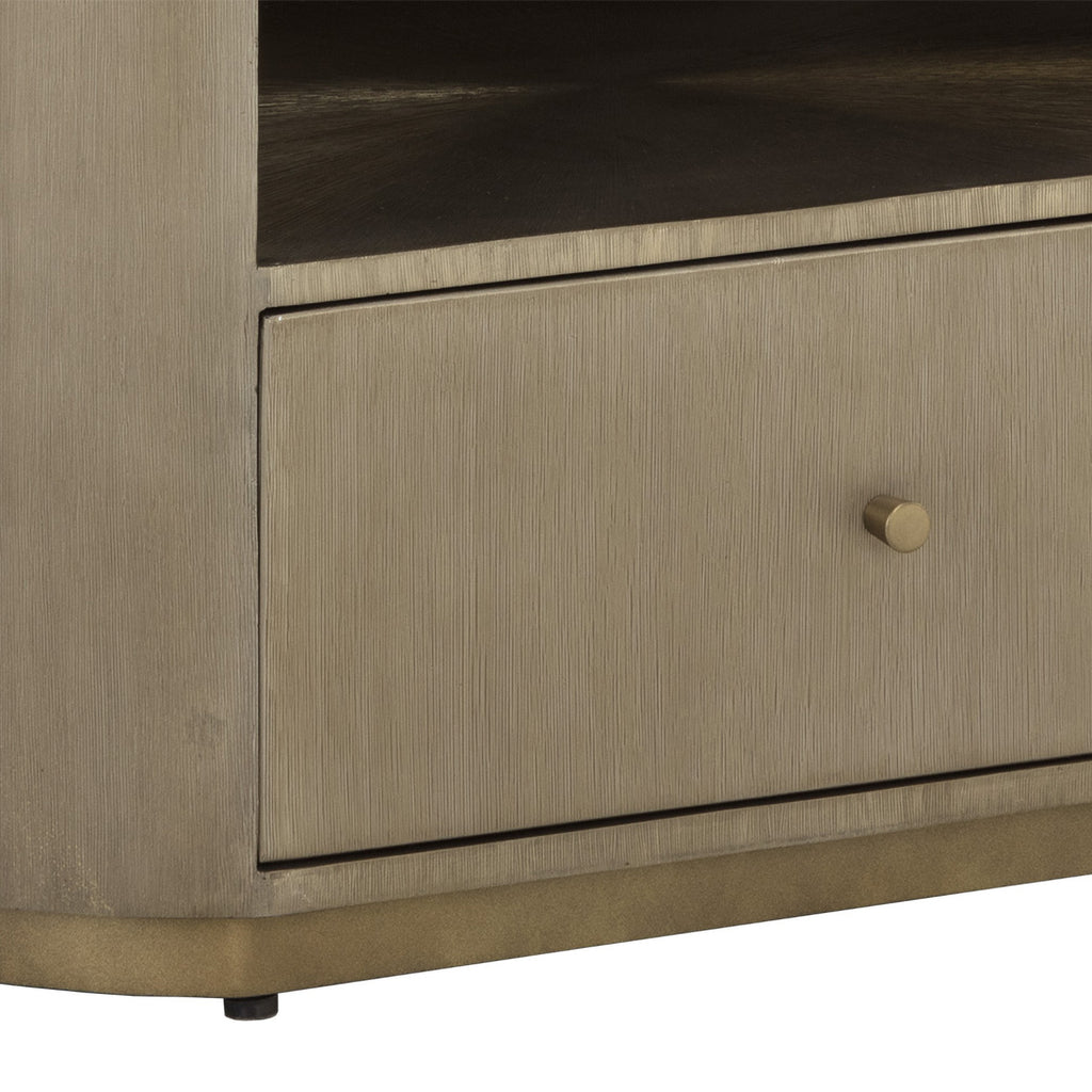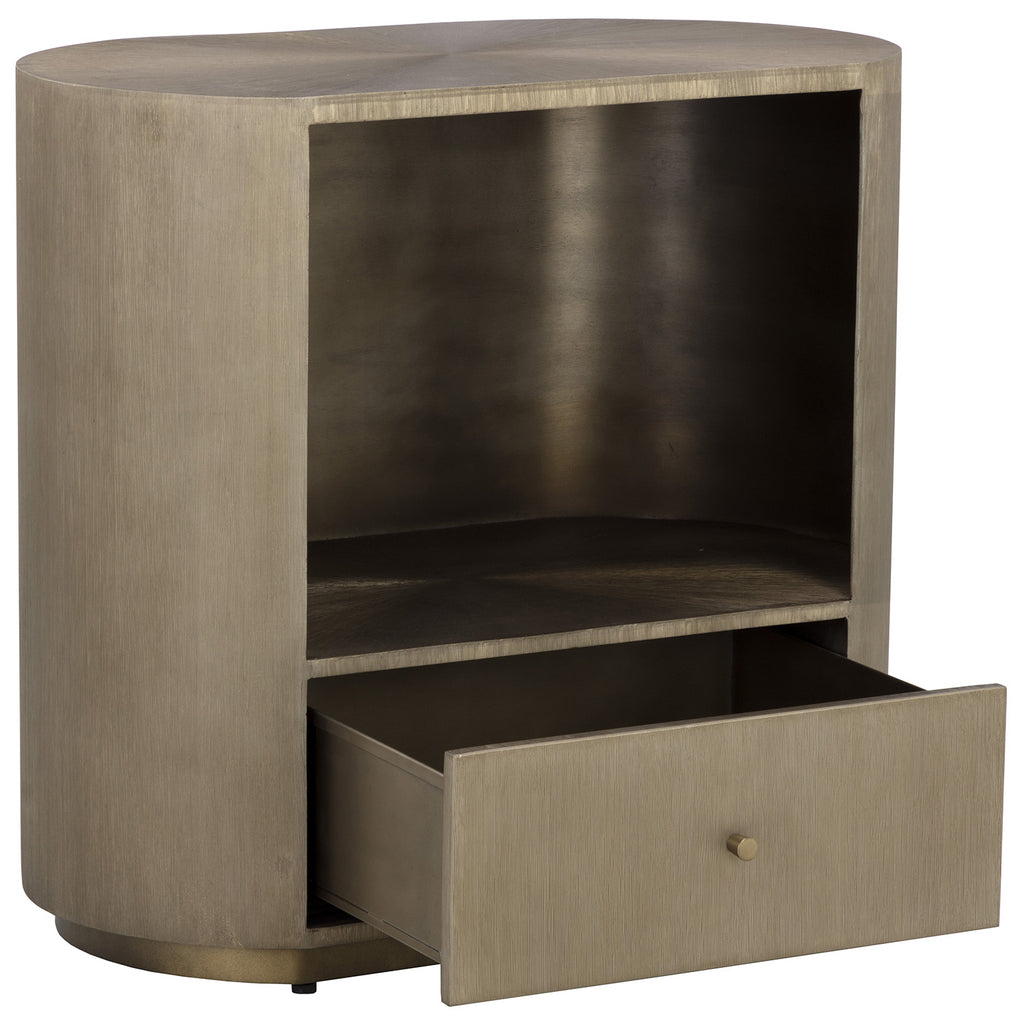 Elevate your bedroom retreat with this intriguing nightstand. A large shelf and drawer provide ample storage. Features a hand-etched and hand-hammered iron frame with an antique brass finish.