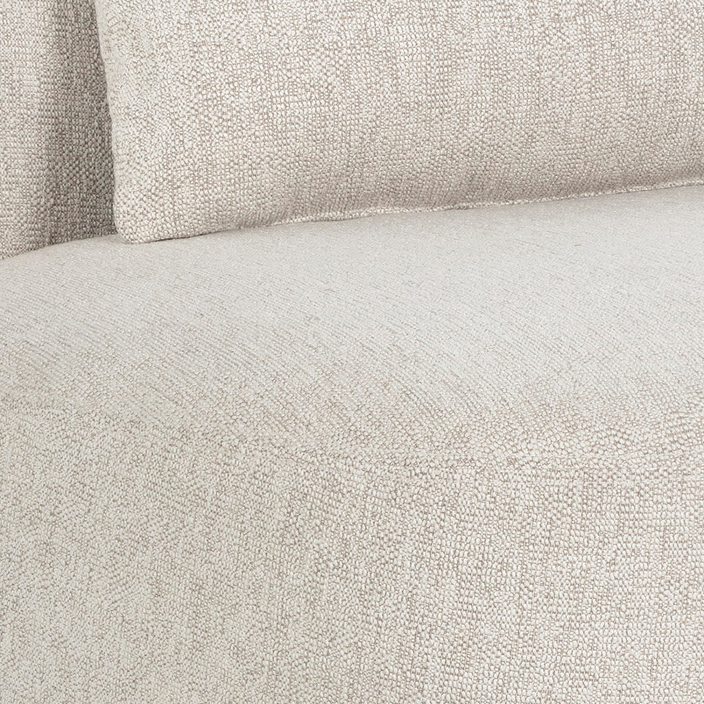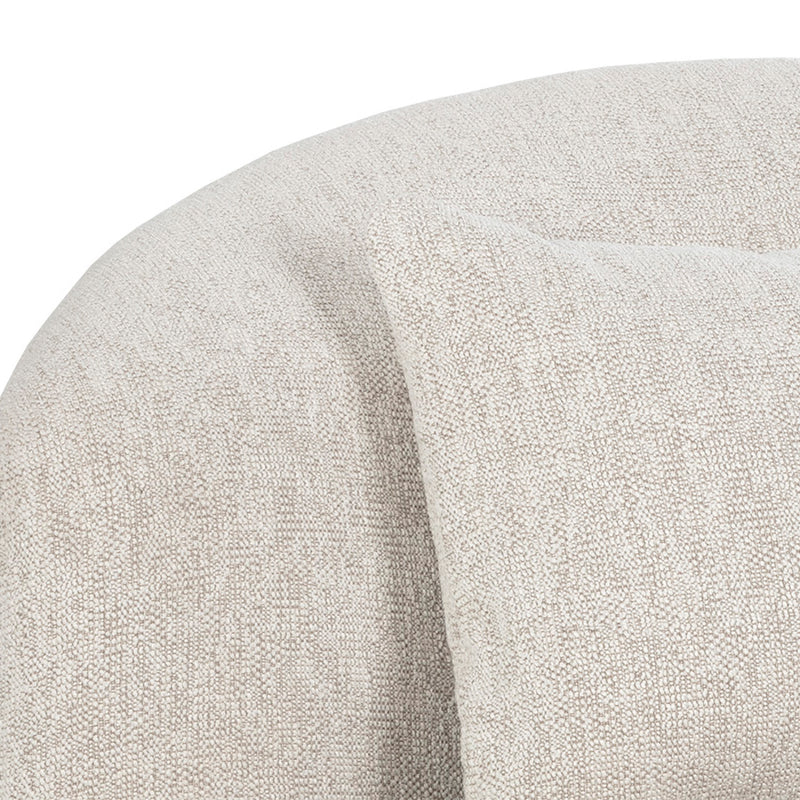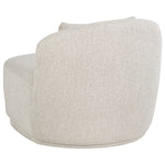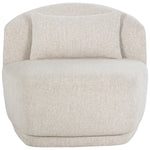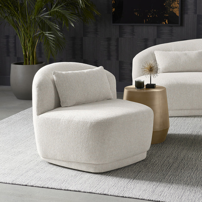 Boasting a design that is all about that curve appeal, this marvelous swivel armless chair will add shape to any space. Stocked in dove cream fabric and completed with a wooden frame. Coordinating sofa and ottoman also available.