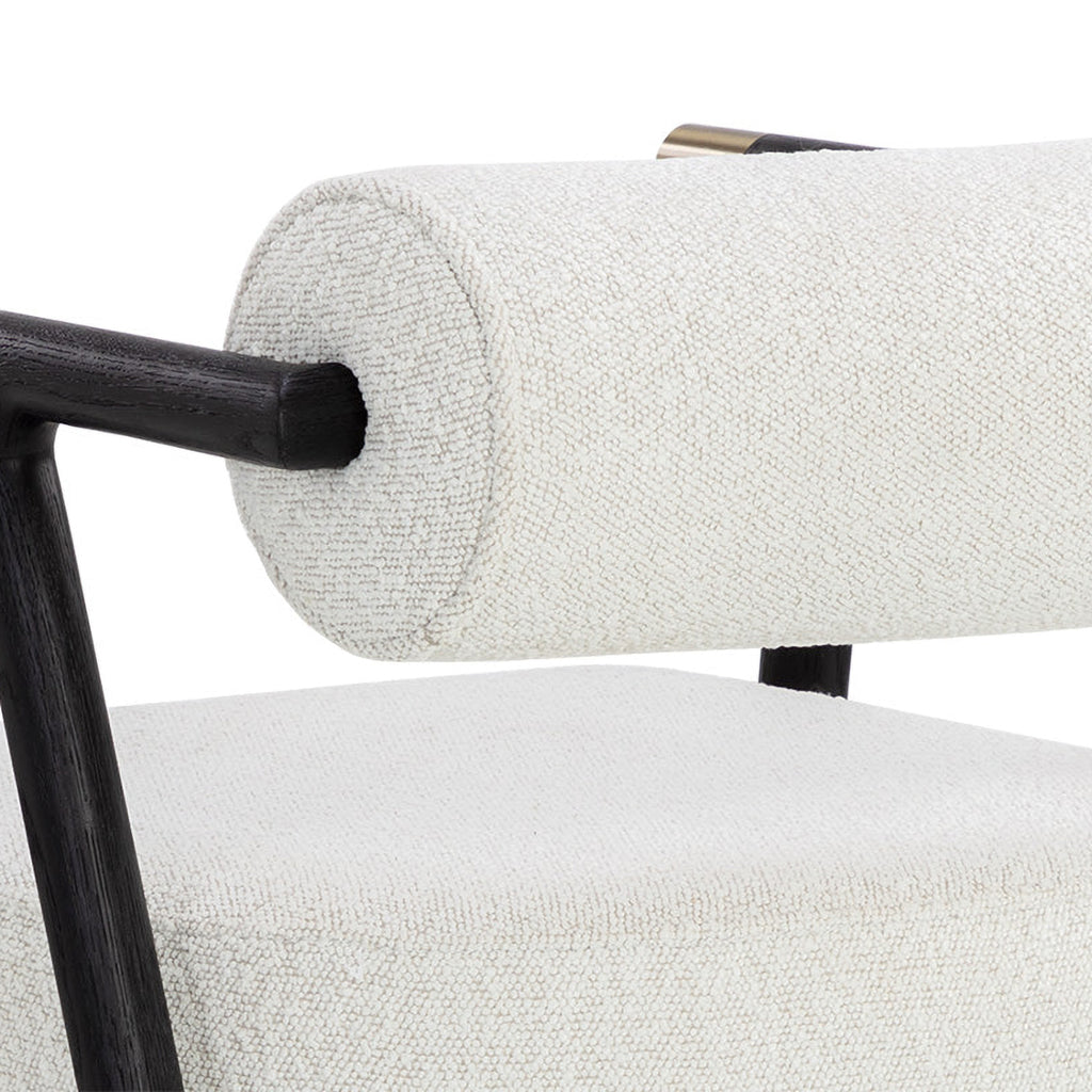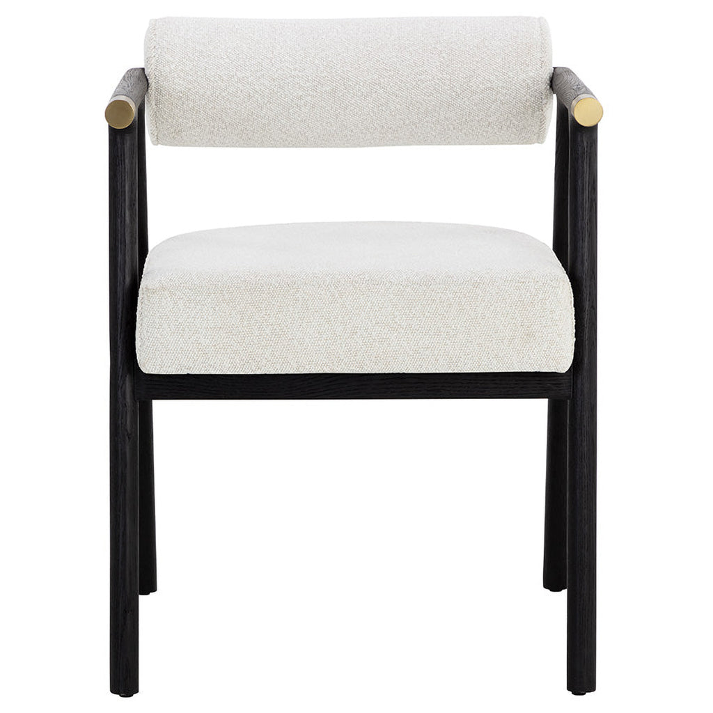 The attractive profile of the Sova Dining Armchair encapsulates modern sophistication. Black oak wood, copenhagen white boucle fabric and brushed brass metal caps create a timeless combination of refined materials. As wood is an organic, porous material, these pieces will contain natural variation of texture and may also exhibit fine indentations and cracks. Wood pieces will also display a disparity of color and grain, and visible knots and burls that add to the character of each piece.