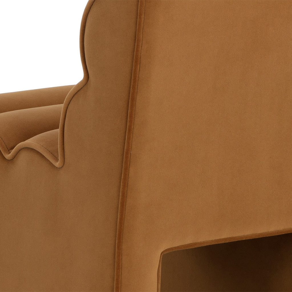 Elevate your dinner gatherings with the bold form of the Stuart Dining Chair. A tufted channel design creates a unique side profile that elevates the drama. Fully upholstered in meg gold fabric with matching piping for added texture and dimension.