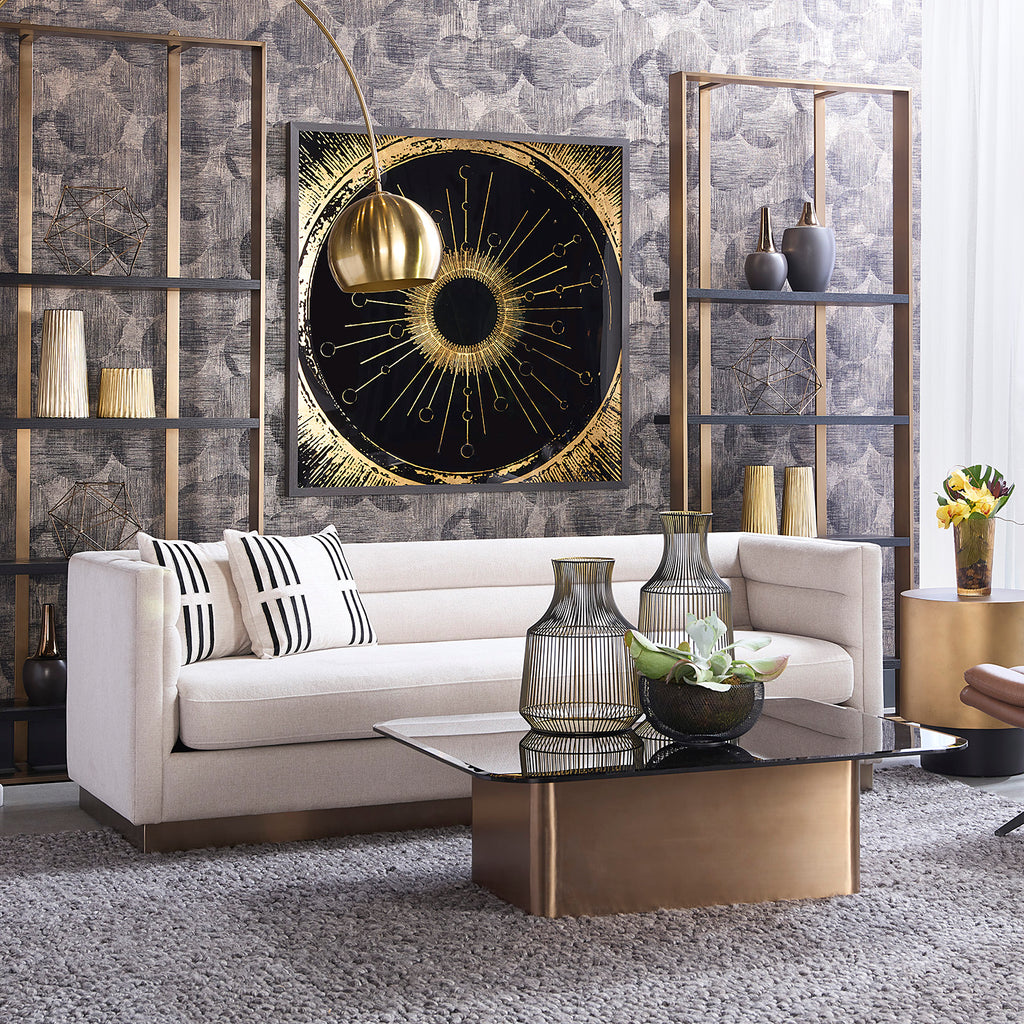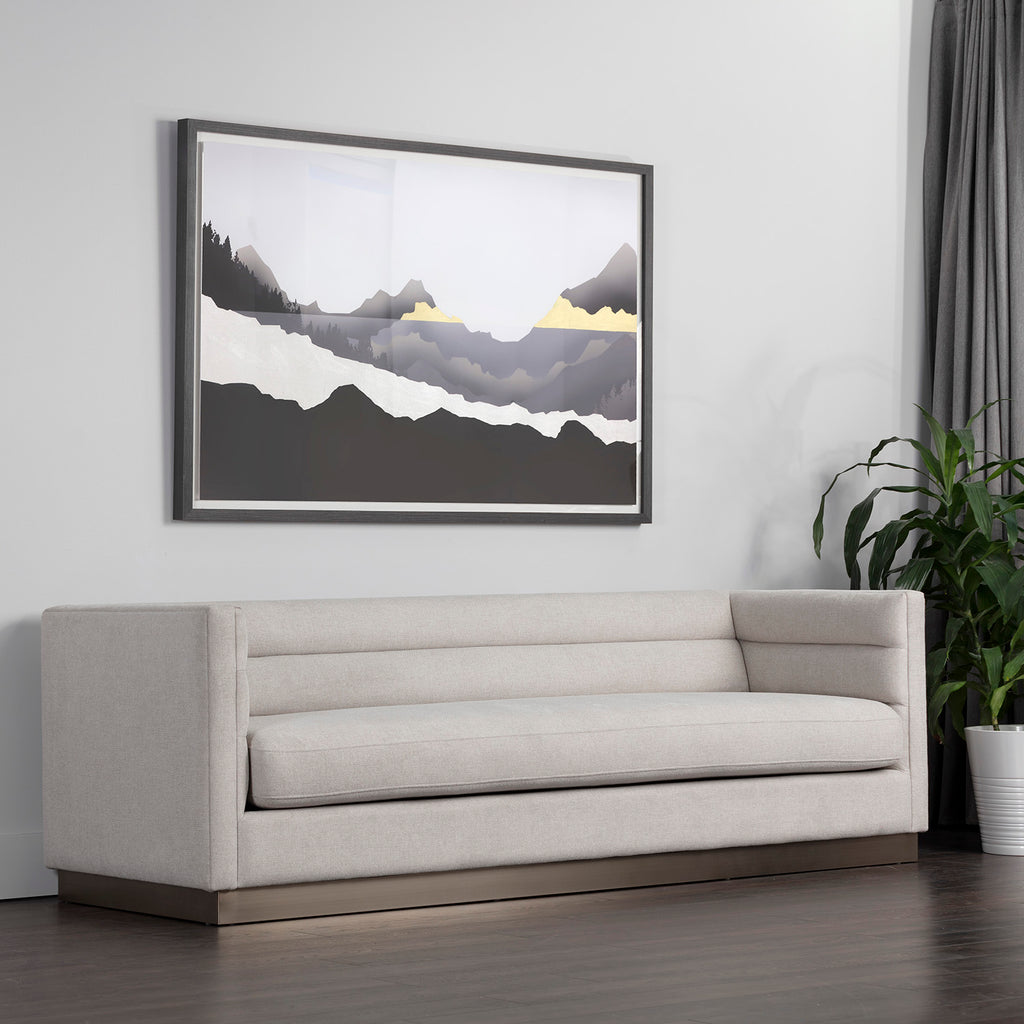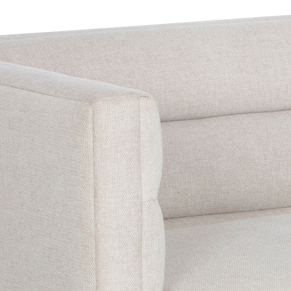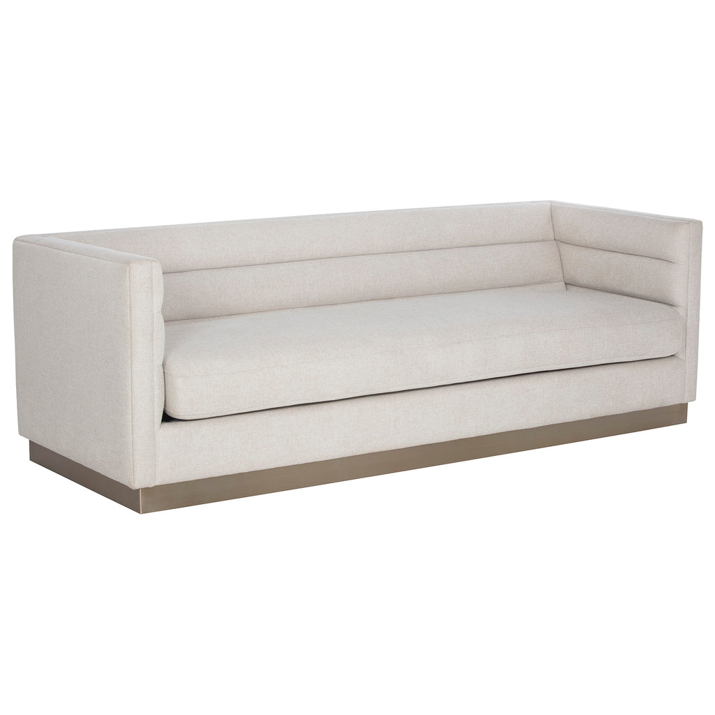 This stunning sofa offers a streamlined design for contemporary elegance. Stocked in belfast oatmeal fabric with horizontal tufting on the interior seatback. Completed with an antique brass stainless steel base.
