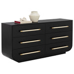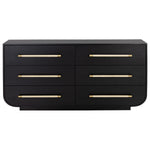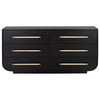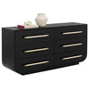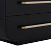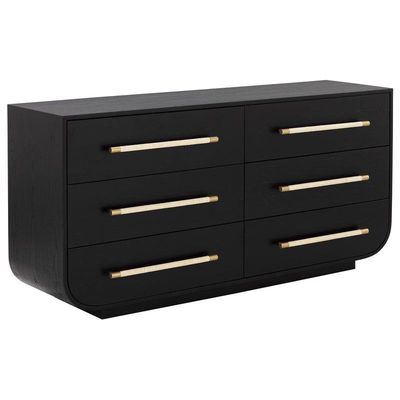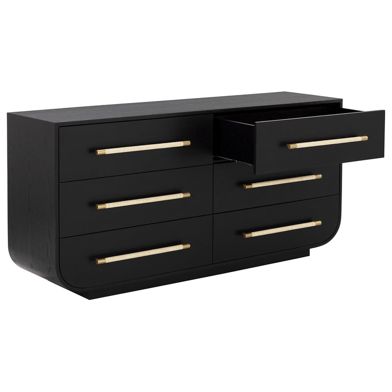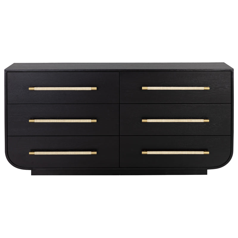 Fluid lines and gentle curves make up the modern silhouette of the Tarrant Dresser. Raffia wrapped handles add an understated touch to the black oak veneer base.