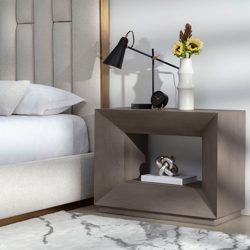 Constructed from solid acacia wood, the Thales Nightstand is a celebration of modern geometric shapes. The design features a simple silhouette that will complement any bedroom space.