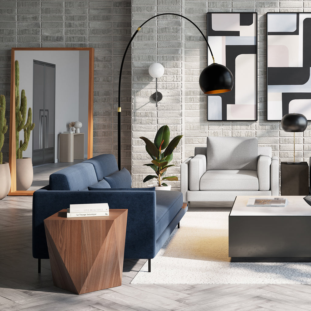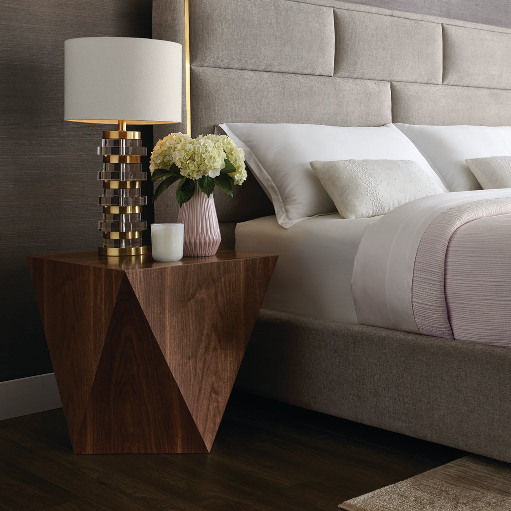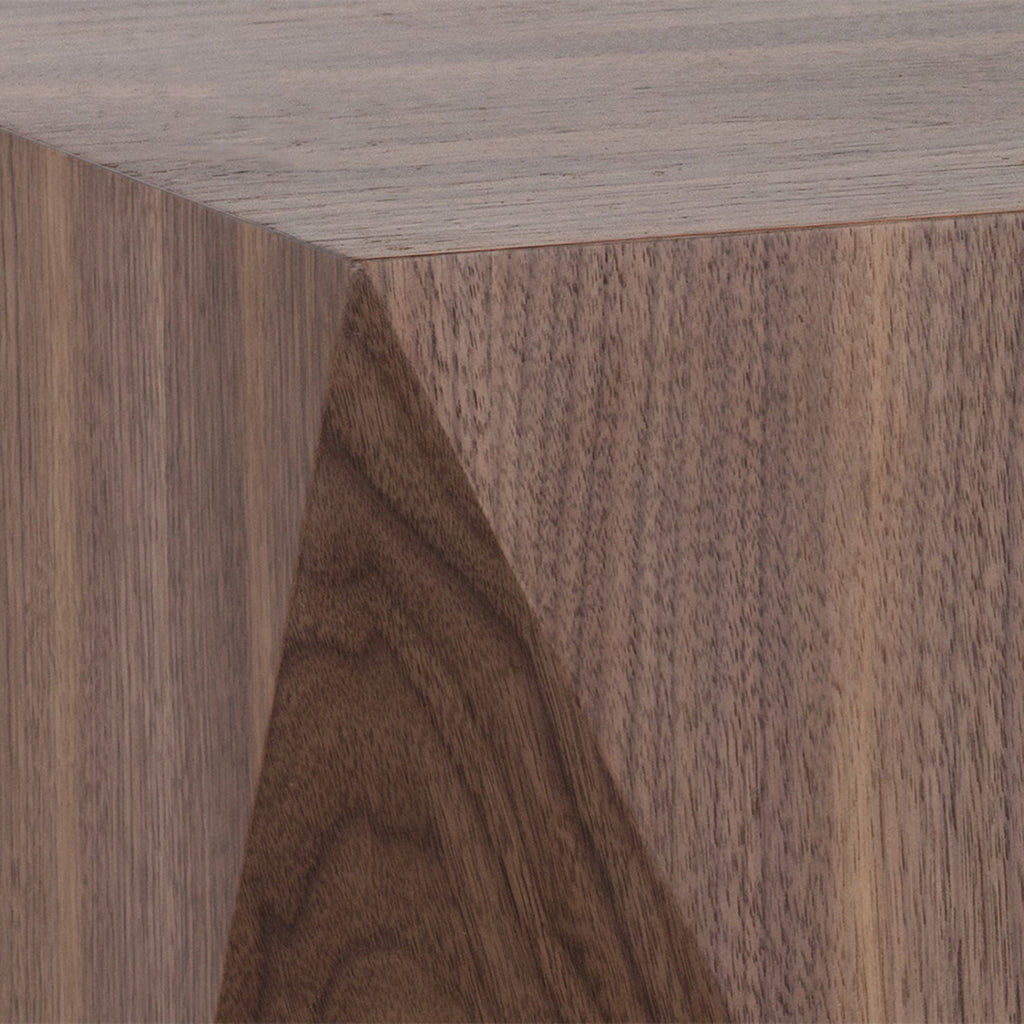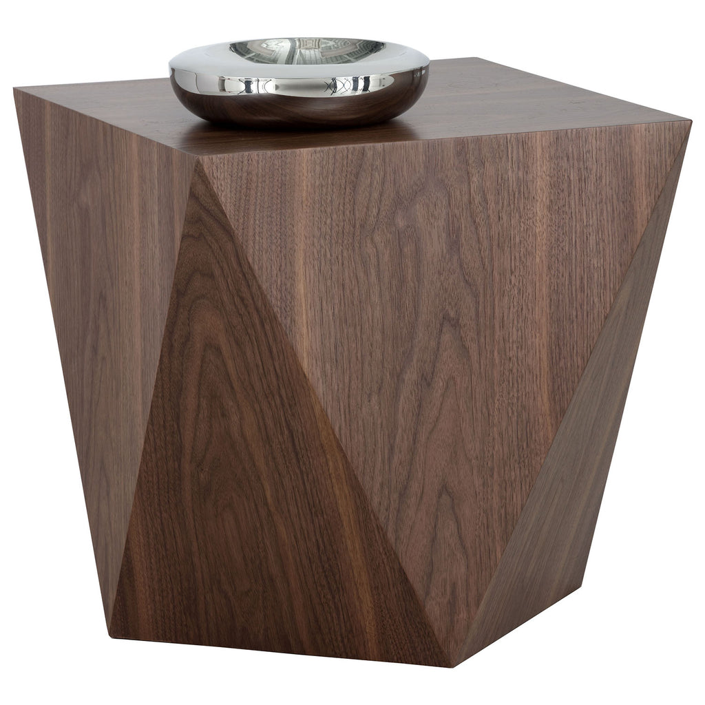 A mid-century modern influenced end table from. Designed with a sleek geometric shape and finished with a rich warm-toned walnut veneer. A captivating piece.