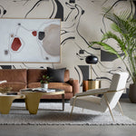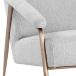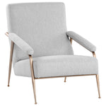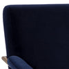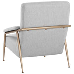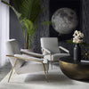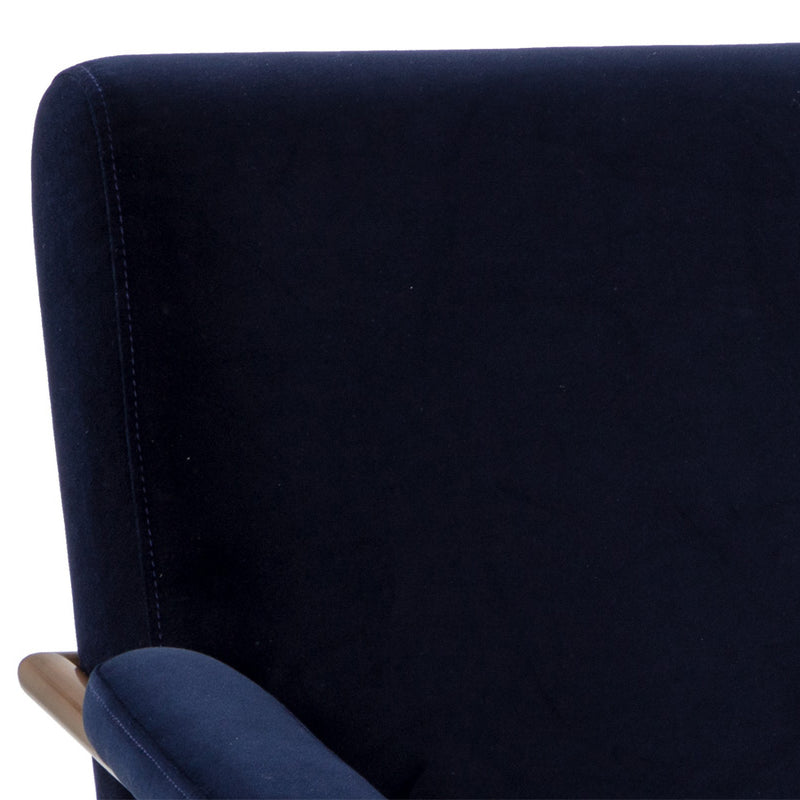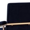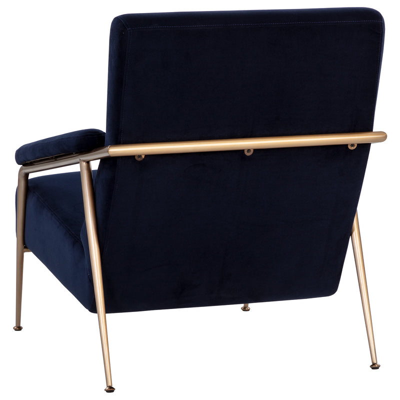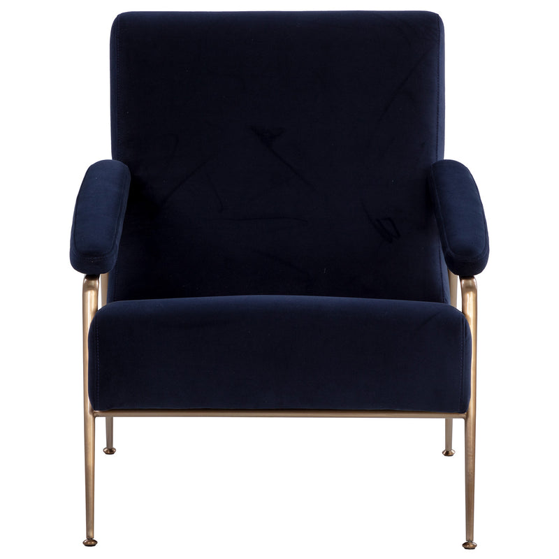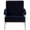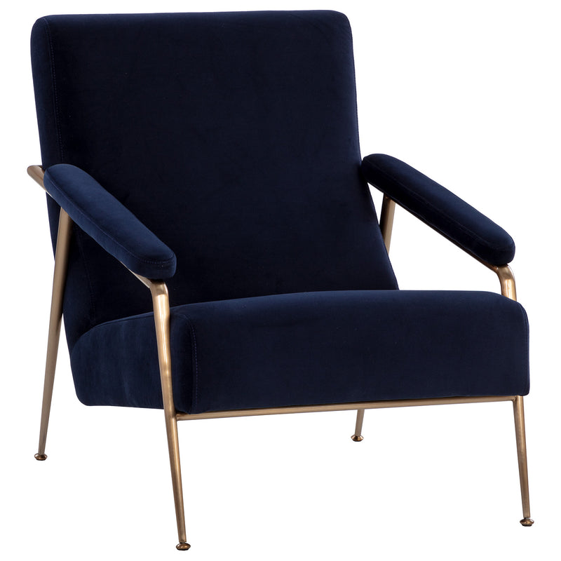 A mid-century lounge chair that features a beautiful design defined by clean lines. Upholstered in abbington navy fabric with a stainless steel frame in an antique brass finish.