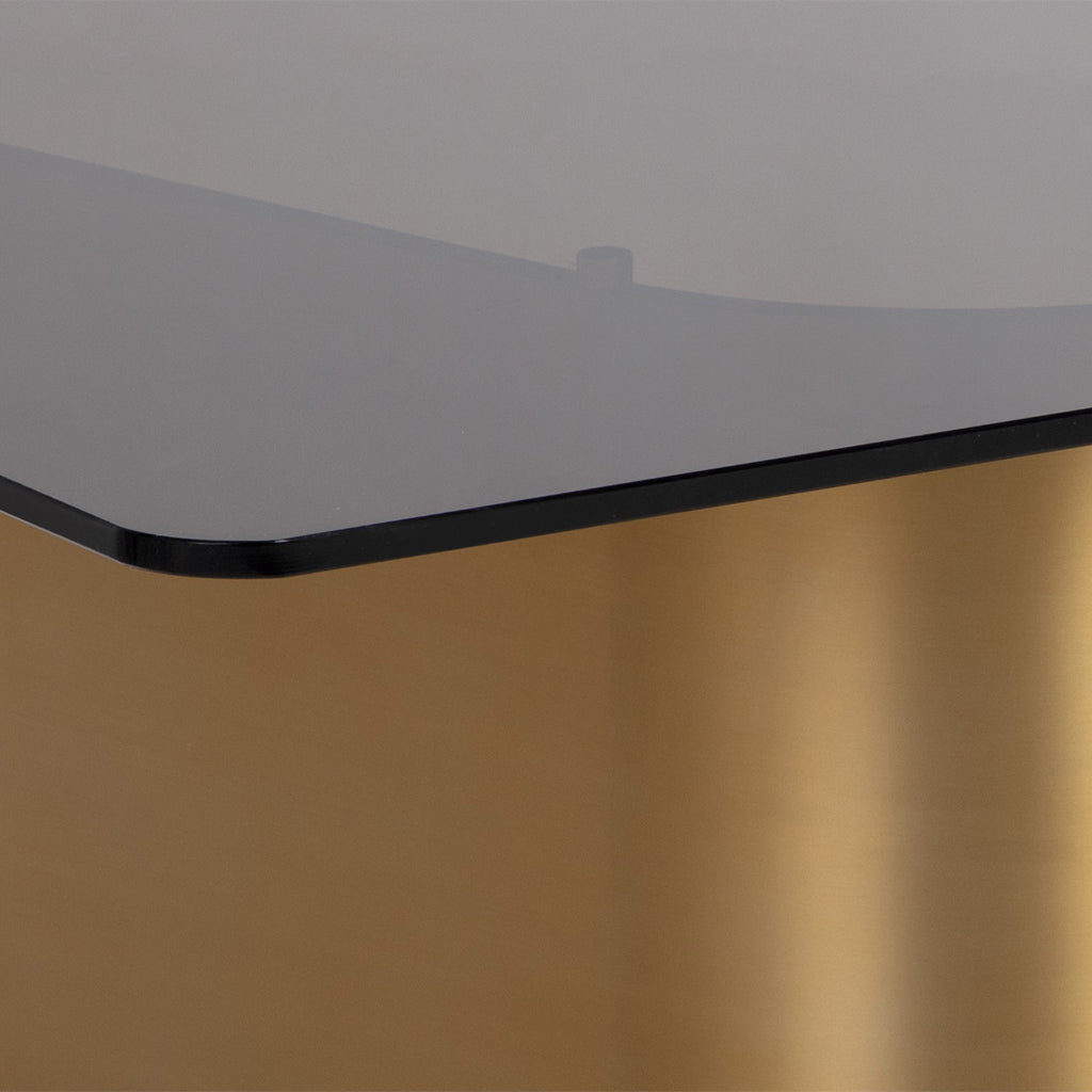 Bold and elegant, the Whisper Coffee Table is a staple for any living room area. The gorgeous brown tones of the tea tempered glass tabletop provide a gorgeous contrast to the gold S-shaped stainless steel base.
