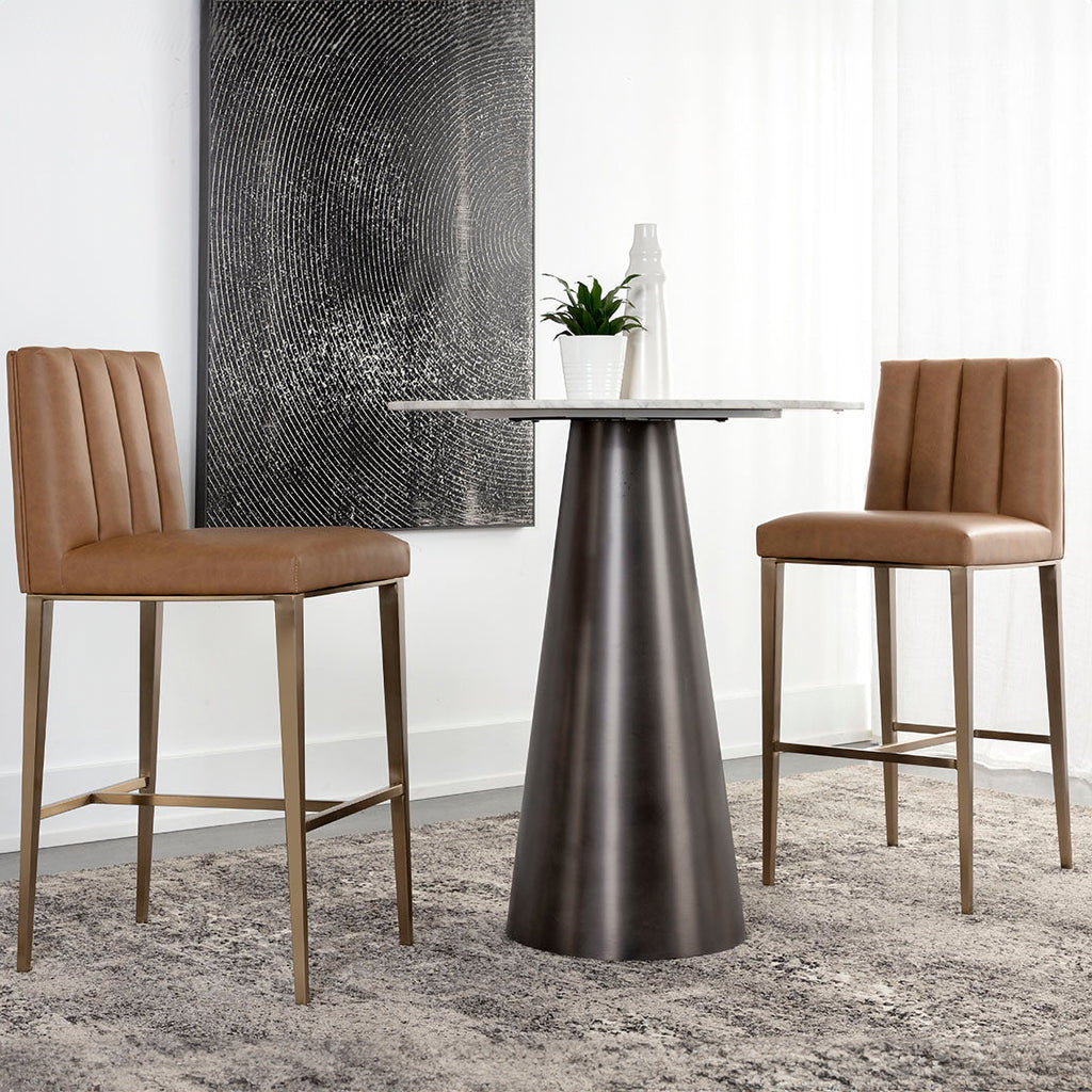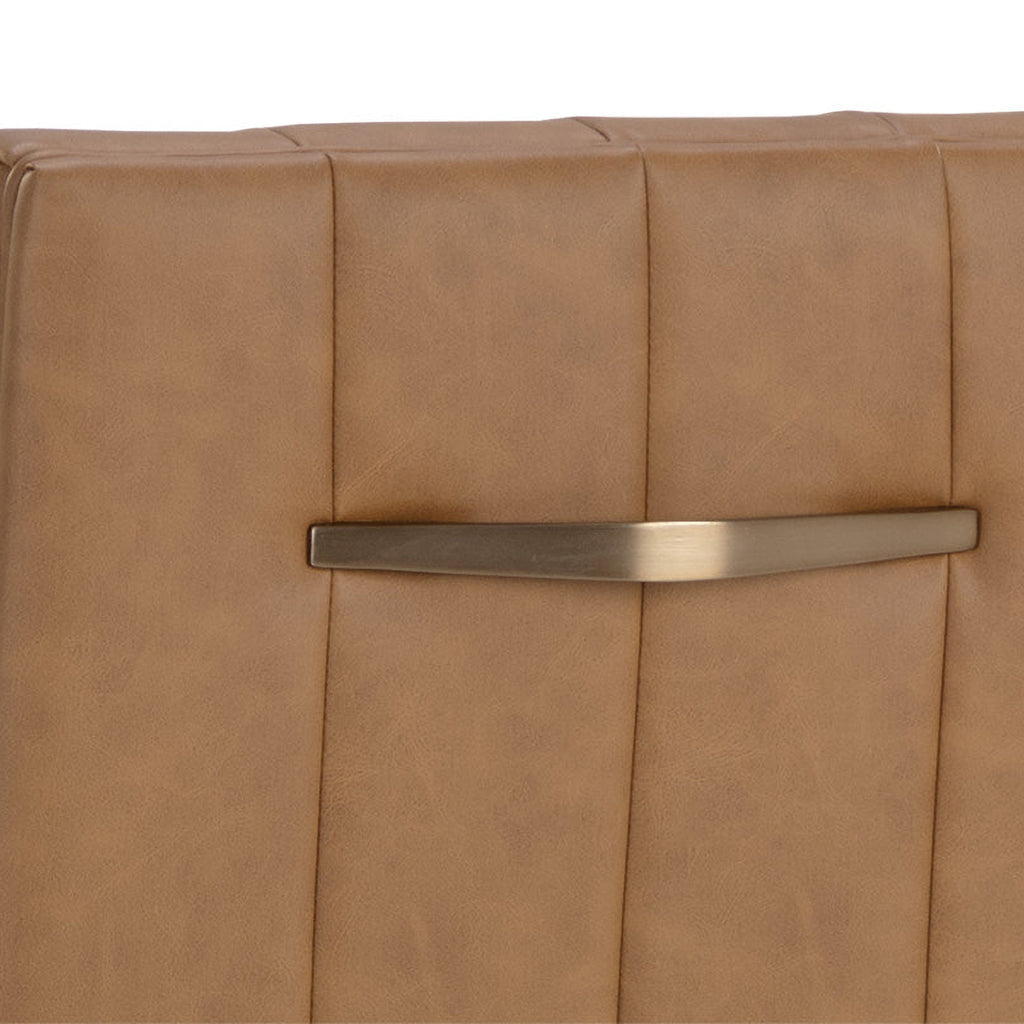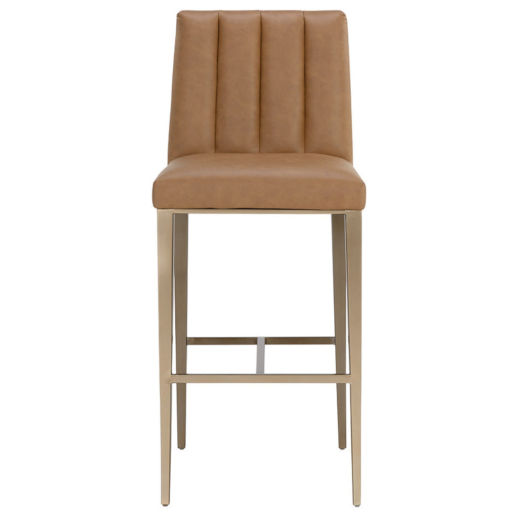 Minimal and classic best describes the Wilbur Barstool. Upholstered in milliken cognac faux leather with vertical channeling on the back seat for added flair. Finished with powder-coated stainless steel legs and a matching handle. Handle With Care: This design has been crafted with faux leather. Faux leather is manufactured to reflect the natural characteristics of leather; as such, color variations, markings, wrinkles, grooves, and light scratches are appreciated characteristics. No two pieces will be alike. Visit our Product Care page for more information on how to ensure the lasting beauty of this piece.