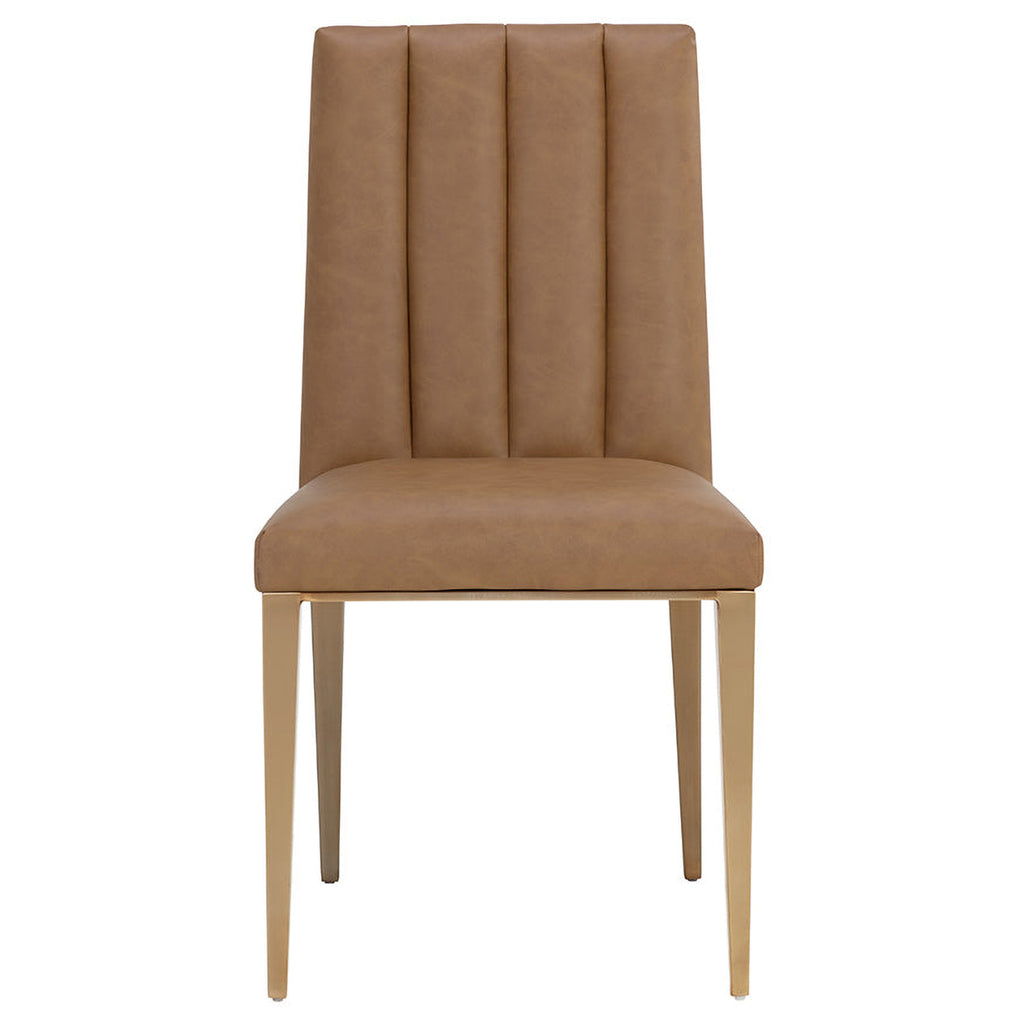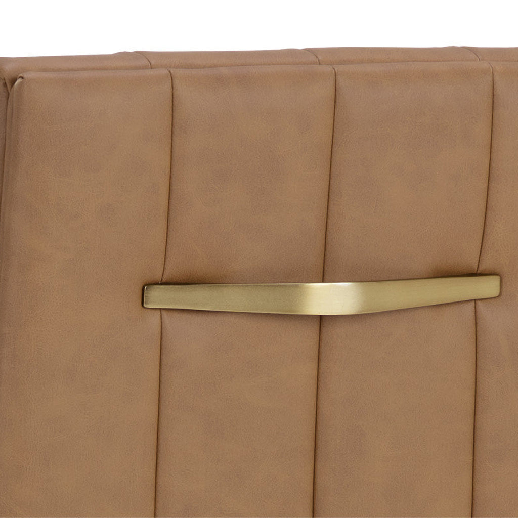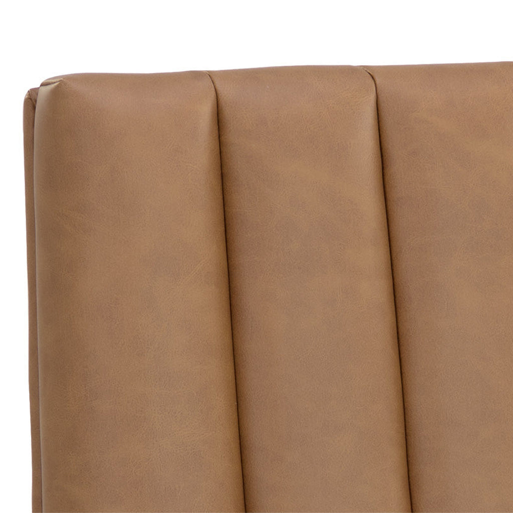 Minimal and classic best describes the Wilbur dining chair Upholstered in milliken cognac faux leather with vertical channeling on the back seat for added flair. Finished with powder-coated stainless steel legs and a matching handle. Handle With Care: This design has been crafted with faux leather. Faux leather is manufactured to reflect the natural characteristics of leather; as such, color variations, markings, wrinkles, grooves, and light scratches are appreciated characteristics. No two pieces will be alike. Visit our Product Care page for more information on how to ensure the lasting beauty of this piece.
