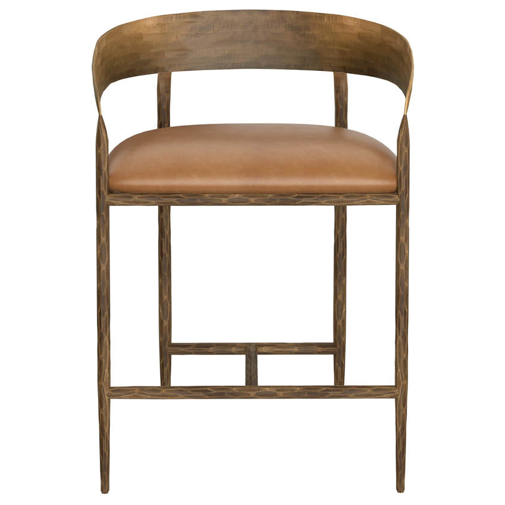 The Zanatta counter stool is all about the subtle details. The hammered metal detailing in the antique brass curved frame provides visual interest that will stand out in any dining space. A tan leather seat completes the look. Handle with Care: This design has been crafted with aniline leather. Leather is a natural material; as such, color variations, markings, wrinkles, grooves and light scratches are acceptable and appreciated characteristics. No two pieces are alike. Visit our Product Care page for more information on how to ensure the lasting beauty of this piece. Made in India. With refined craftsmanship, this design was brought to life by skilled local artisans. Due to the nature of handcraftsmanship, unique imperfections such as fissures, markings and variations in color and shape are welcomed and appreciated characteristics for a truly one-of-a-kind piece.