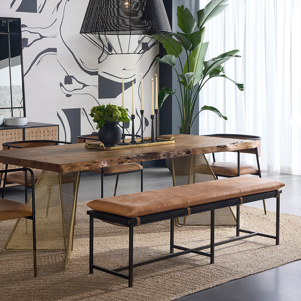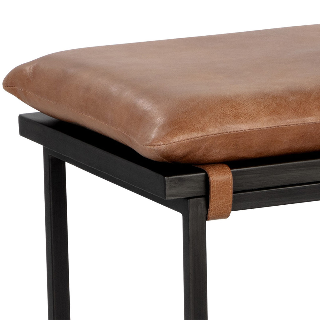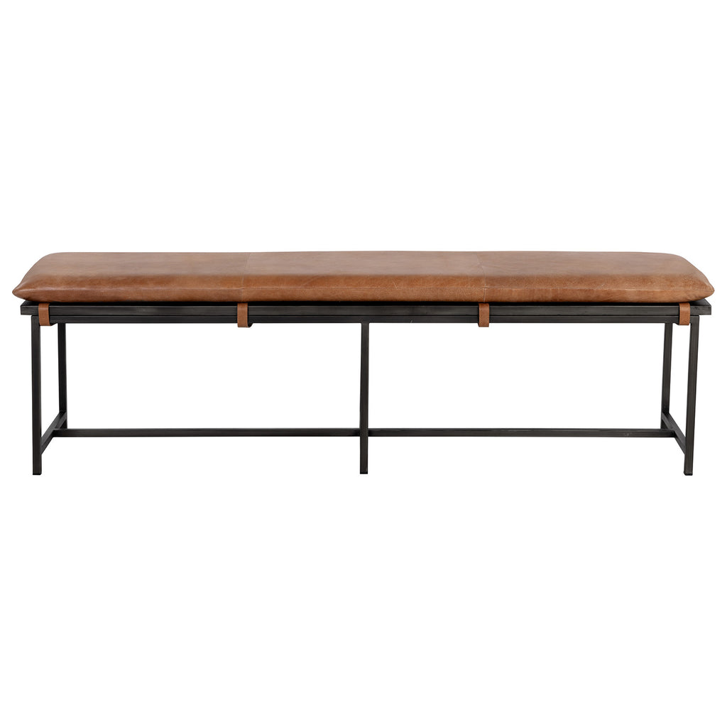 An incredibly designed bench that offers a refined and timeless style. Upholstered in tan leather and completed with a gunmental steel frame.