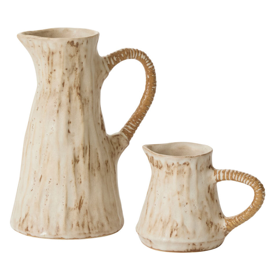 Bring the beauty of nature to the dining table with the small Sycamore Pitcher, featuring a beautiful bark inspired texture and finish. This small scale pitcher holds 16 or 48 ounces, has a wide base, curved handle with carved lines, and an angled spout. Serve beverages family style from both sizes of pitchers alongside the rest of the Sycamore Collection.