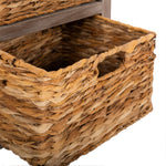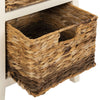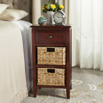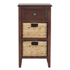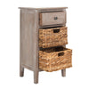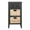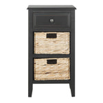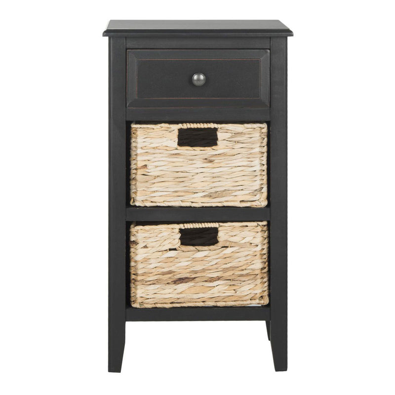 A neat little side table with top drawer and two removable woven rattan baskets with cutout handles, this distressed black piece is brimming with storage space. Crafted of pine in distressed black finish, it makes finding what you need easier than ever.