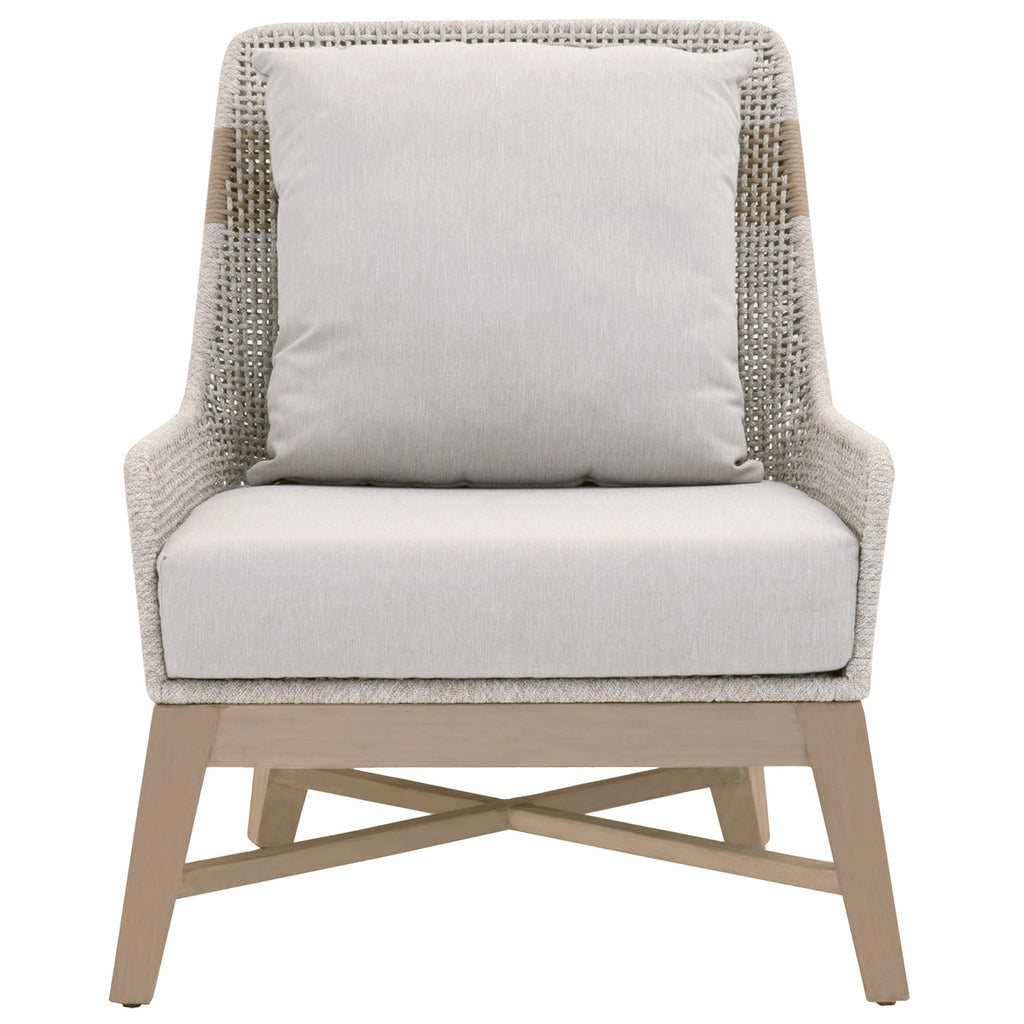 The beachy look of the Tapestry Outdoor Club Chair by Essentials For Living will bring a coastal ambiance to any backyard, patio, or porch. It measures 29" wide, 34" deep, 33" high, with a seat height of 18". Constructed with a steel frame and solid washed ever teak legs, this club chair is not only sturdy, but durable for outdoor use. A taupe and white rope is tightly woven with an eye-catching solid taupe stripe interwoven at the center of the seat back. From a distance, the taupe and white rope gives a light gray appearance but up close the mixture of taupe and white threading can be seen. The teak legs feature crossed leg stretchers and a neutral finish that is resilient to change from weather elements. It contains removable all-weather seat and back cushions made with performance pumice olefin fabric. The cushions and chair should be stored away in extreme conditions. The chair provides comfort with style and will be the perfect addition to any outdoor space.