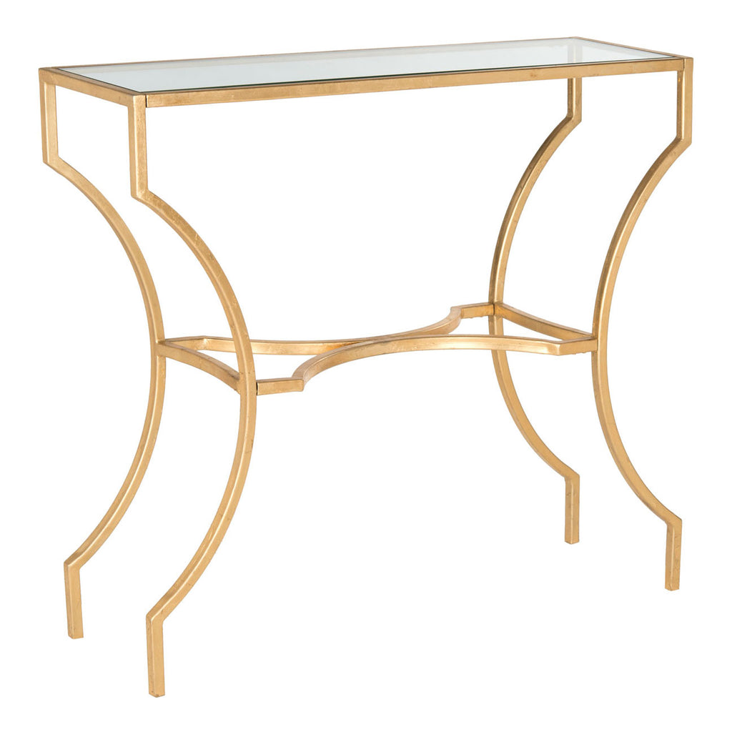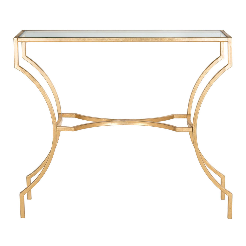 The elegantly curved base of this console adds drama to traditional rooms while providing an airy look with top of tempered glass. This opulent piece is crafted of solid iron with a gold leaf finish protected with lacquer for enduring beauty.