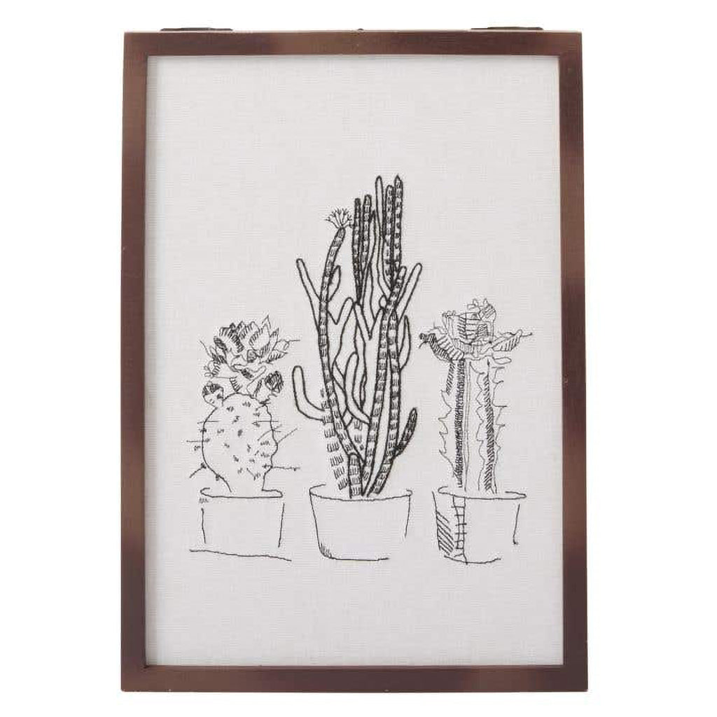 The tactile Tatacoa Wall Art is an ode to the desert beauty with delicately embroidered black line work of a cacti trio on a white cotton textile in a natural wood frame. This simple, stunning piece layers beautifully with all 3 Tatacoa art pieces.