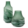 The teal color combines the calming properties of green with the renewal qualities of green. It is a revitalizing and rejuvenating color that we combined with a frosted top swirl texture and a fluid patterned base. The translucent and opaque finishes together highlight these vases quality and depth as a décor element.