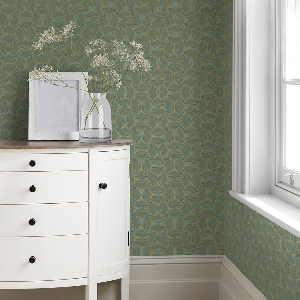 These swanky scallops make a contemporary splash in your space. Bring stylish, art deco design into bathrooms, kitchens, and more with this metallic geometric wallpaper print available in green and neutral color options.