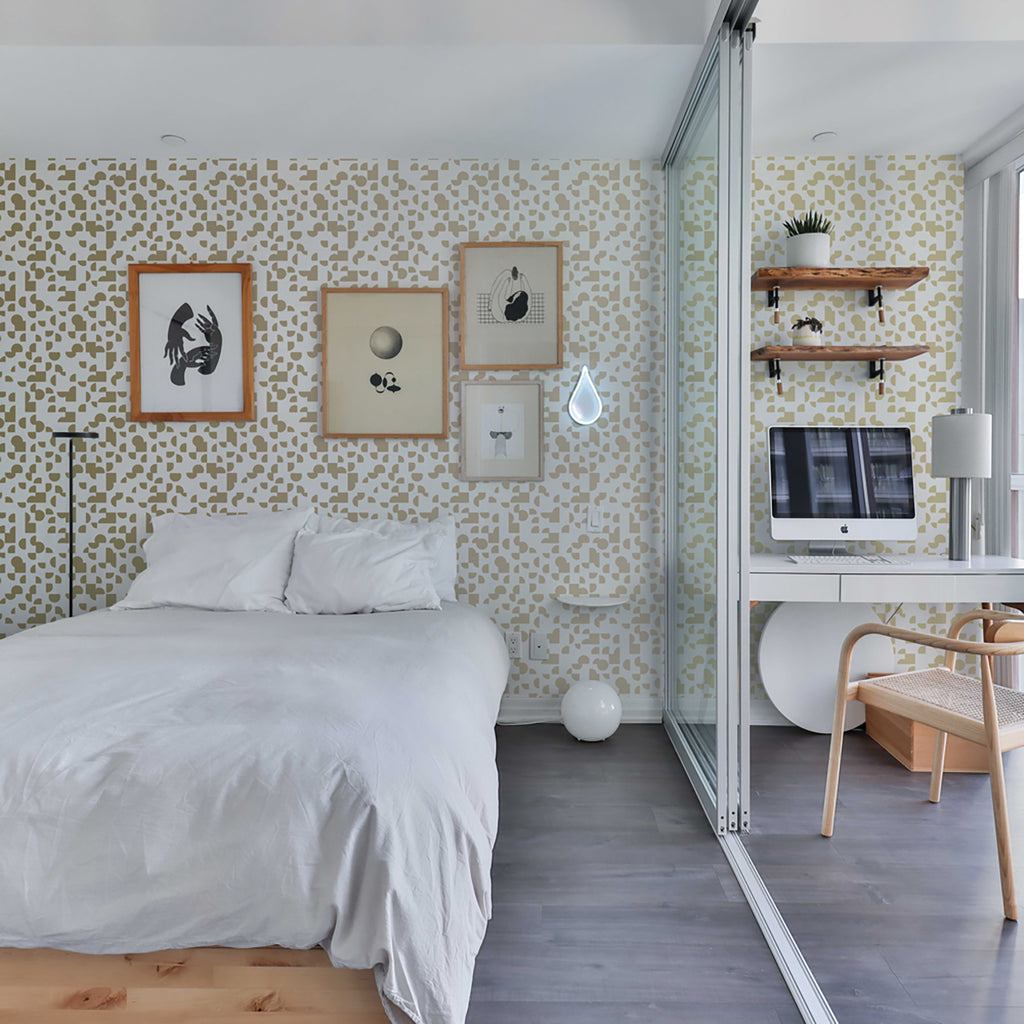 Considered compositions add exuberance to your space. This print feels fresh and modern, bringing a playful twist to the classic dot peel and stick wallpaper. Tempaper Mod Geo wallpaper is available in the following colorways: metallic gold/white, metallic gold/black, metallic silver and dark blue.