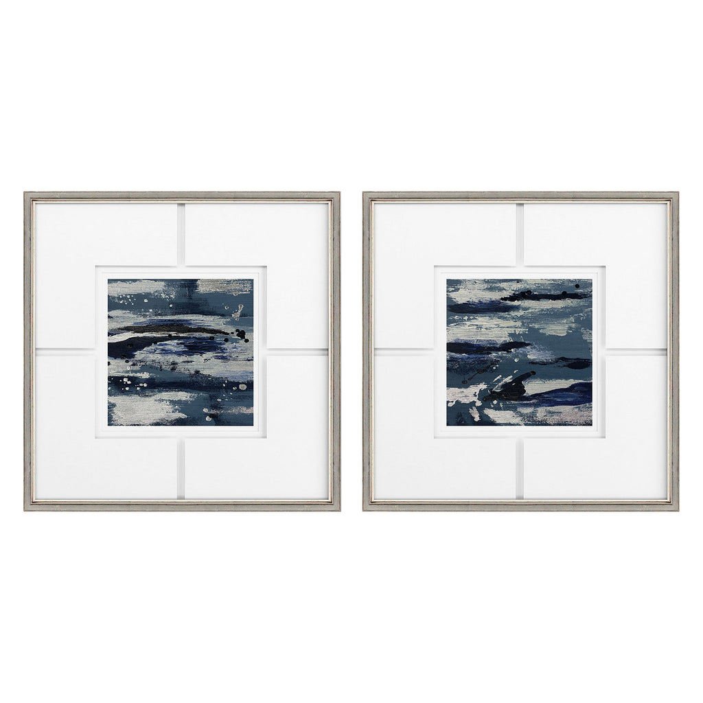Exclusive hand painted mixed media with silver leaf. Framed in a silver wood shadow box style moulding with dark accents and black painted side. Sold as set of two.