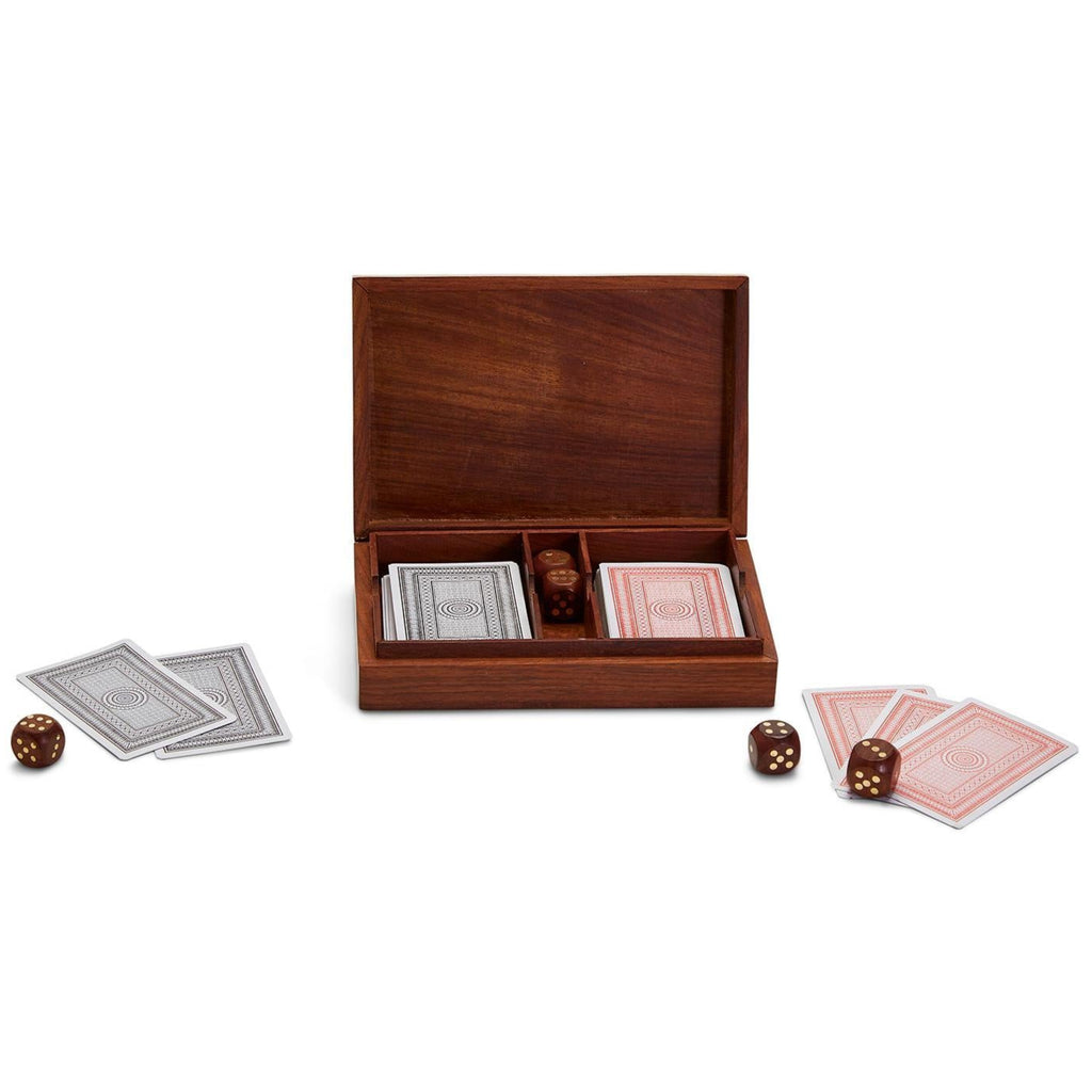 With the popularity of card and dice games, this acacia wood hinged box provides easy access to a wonderful quality card and dice set. Each box has a soft and polished finish with card and dice brass inlays.