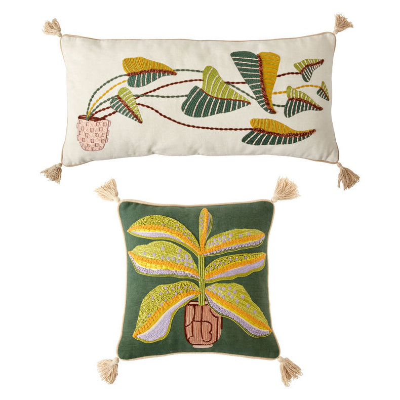Bring shades of green to your soft furnishings with this vibrant, thriving potted plant embroidered on the Thrive Pillow. A variety of embroidery techniques & playful color combos of create an artistic scene designed by Jessica Hiemstra. A textured background with piped edges & 4 corner tassels offer a cohesive, finished look. Spot cleaning recommended.