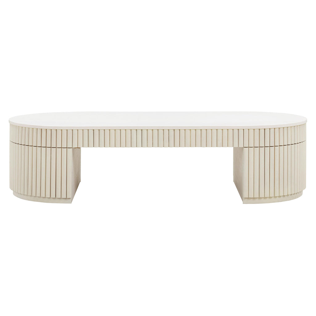 Introducing our TOV Furniture Bella Cream Oval Coffee Table, a stylish blend of artistry and practicality that's perfect for any modern living space. Crafted from solid acacia wood with intentional light staining, its channeling design creates a stunning stained glass-like effect, reminiscent of natural fired ceramic pieces yet boasting a subtle matte texture. With a glossy top for easy cleaning and a sculptural base, this table effortlessly blends monochromatic vibes with 'California Cool' style, making it the ultimate centerpiece for chic living spaces.