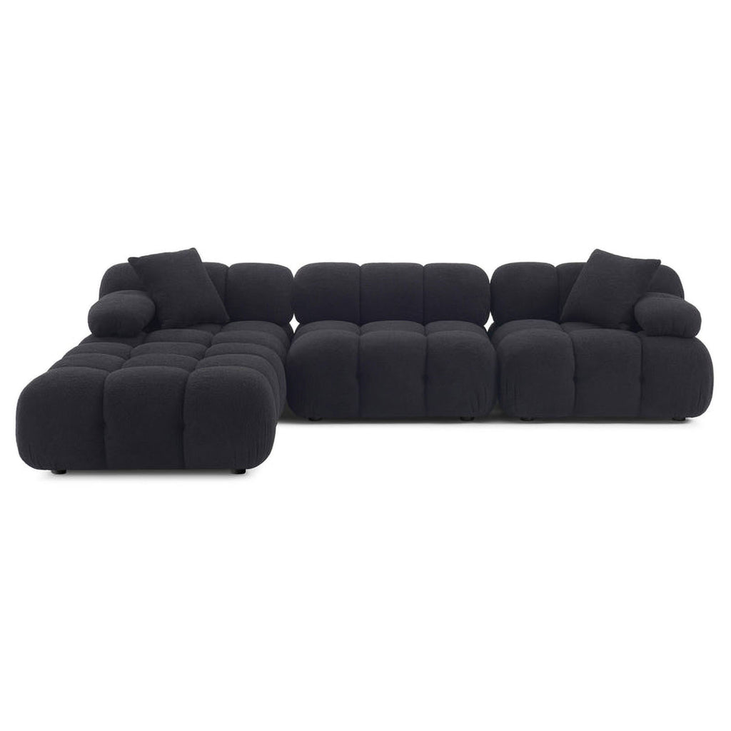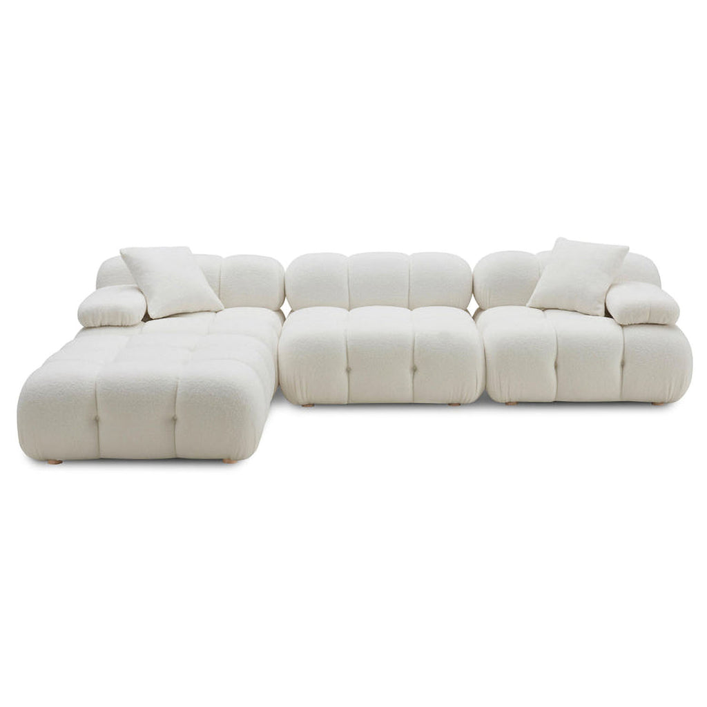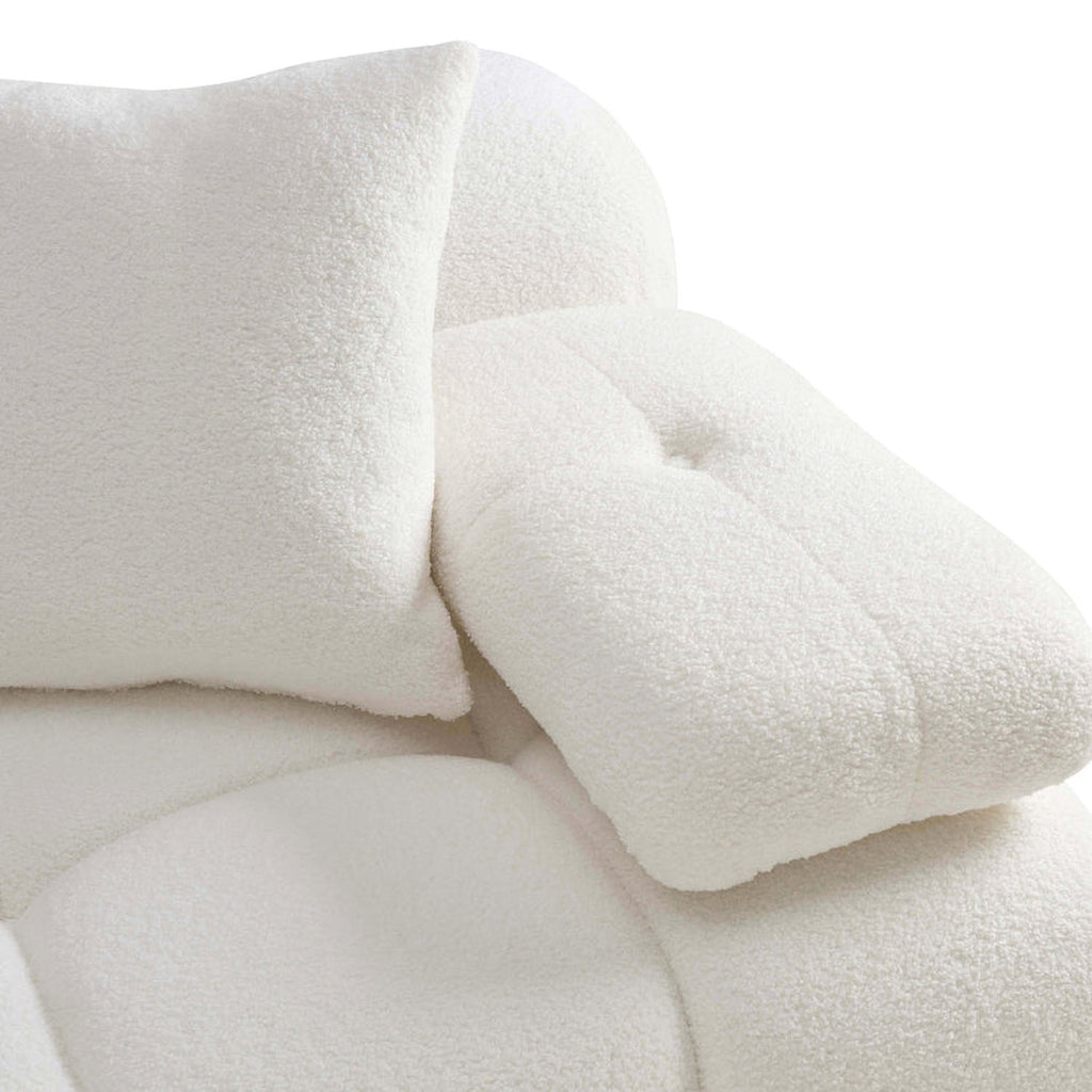 Introducing the Calliope Modular Collection, featuring ultra-soft upholstery that brings unmatched comfort. The deep hand-tufted structure creates the cushioning curves reminiscent of a brioche bun, enveloping you in a pillowy silhouette. With a modular layout allowing for endless configuration possibilities, the detached movable arm cushions add versatility, enabling you to customize your space easily. Available in cream or black vegan shearling and cafe au lait performance velvet options.