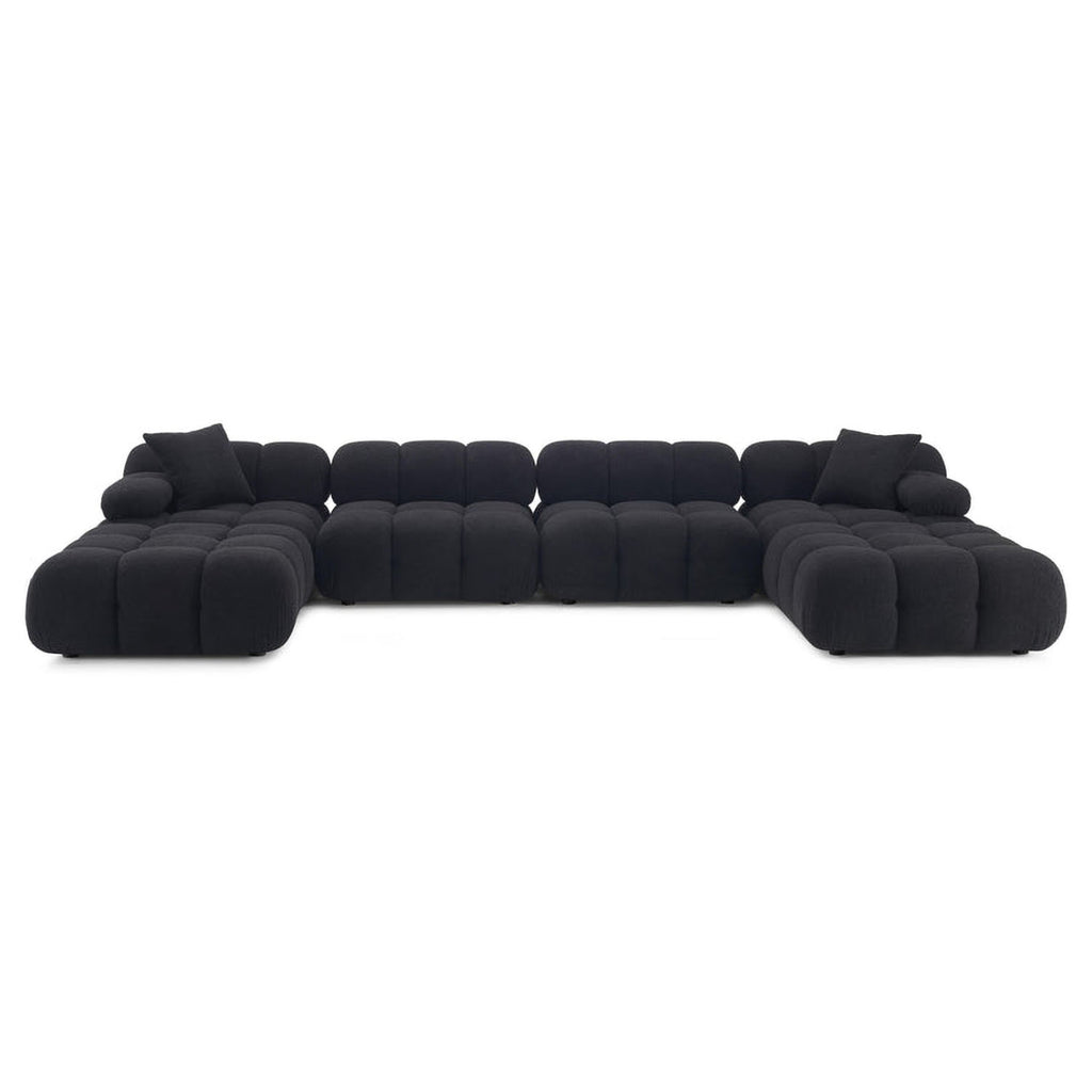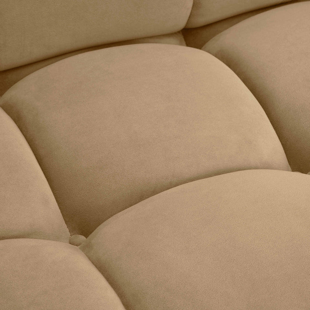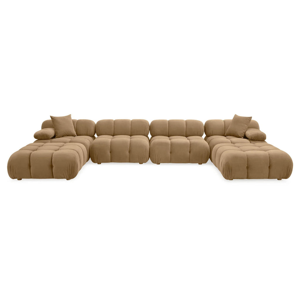 Introducing the Calliope Modular Collection, featuring ultra-soft upholstery that brings unmatched comfort. The deep hand-tufted structure creates the cushioning curves reminiscent of a brioche bun, enveloping you in a pillowy silhouette. With a modular layout allowing for endless configuration possibilities, the detached movable arm cushions add versatility, enabling you to customize your space easily. Available in cream or black vegan shearling and cafe au lait performance velvet options.