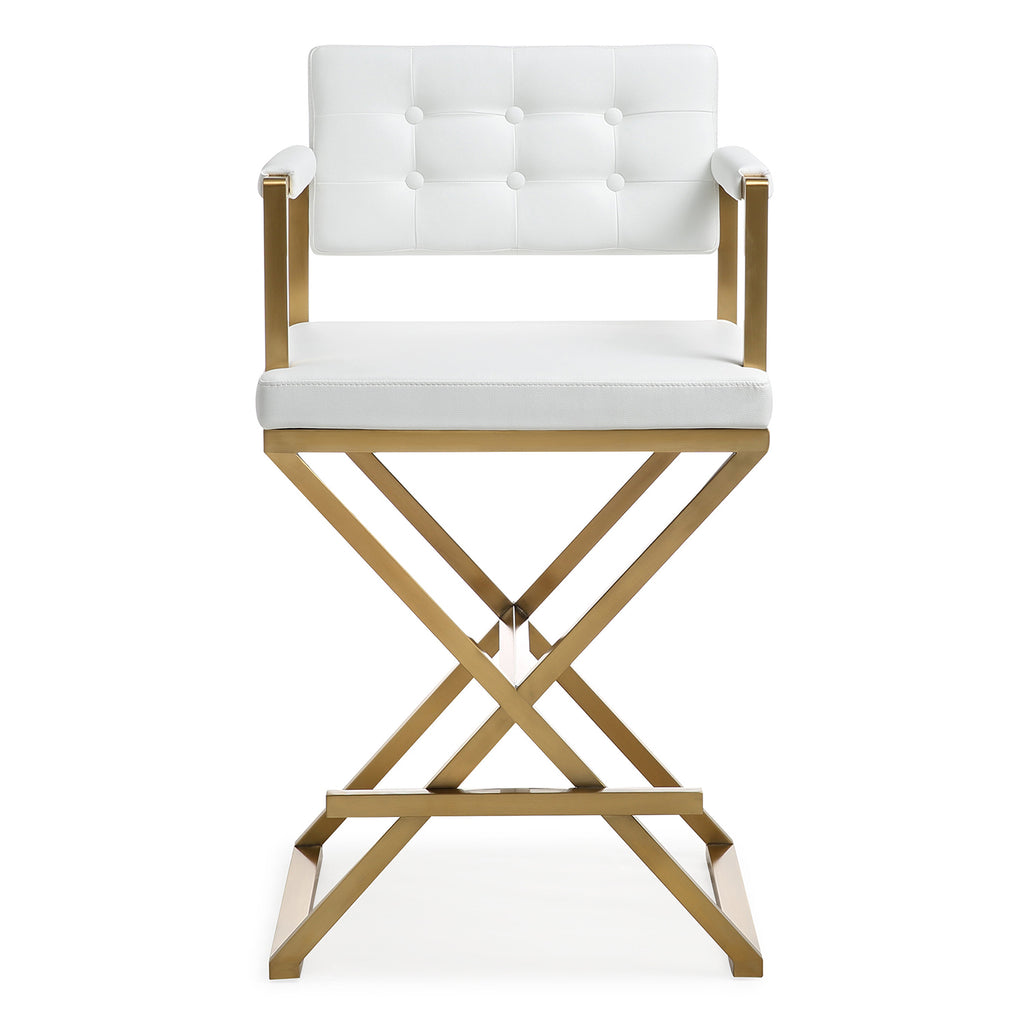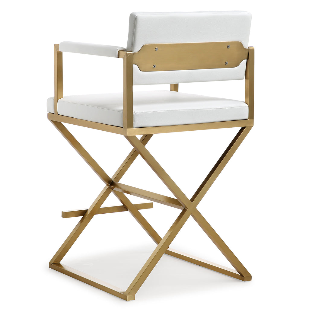 Furnish your kitchen or bar area in contemporary style with the Director stool. The gold solid stainless steel frame provides a sturdy base, while the plush extra deep seat and footrest ensure maximum comfort. The combination of angles and gentle curves gives this stool an eye-catching appearance, while the neutral color allows it to match well with any decor.