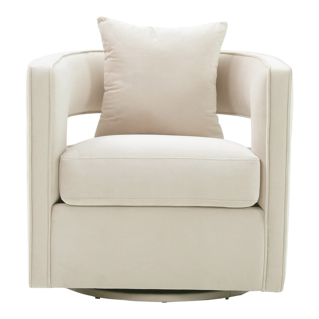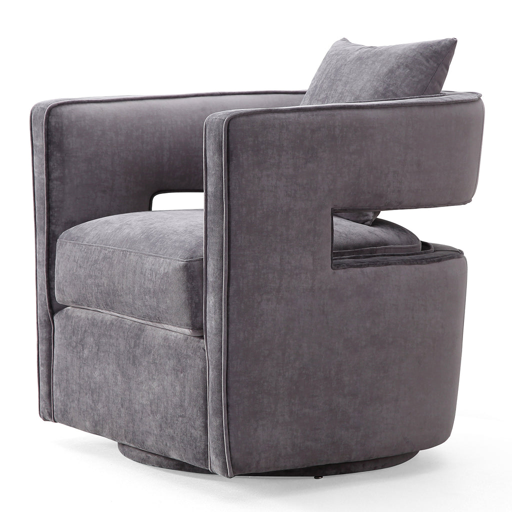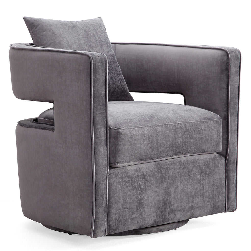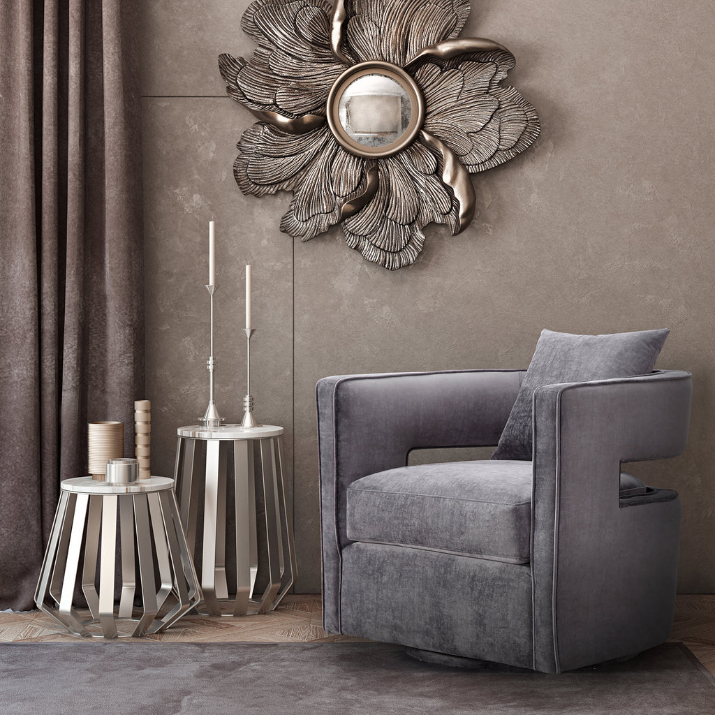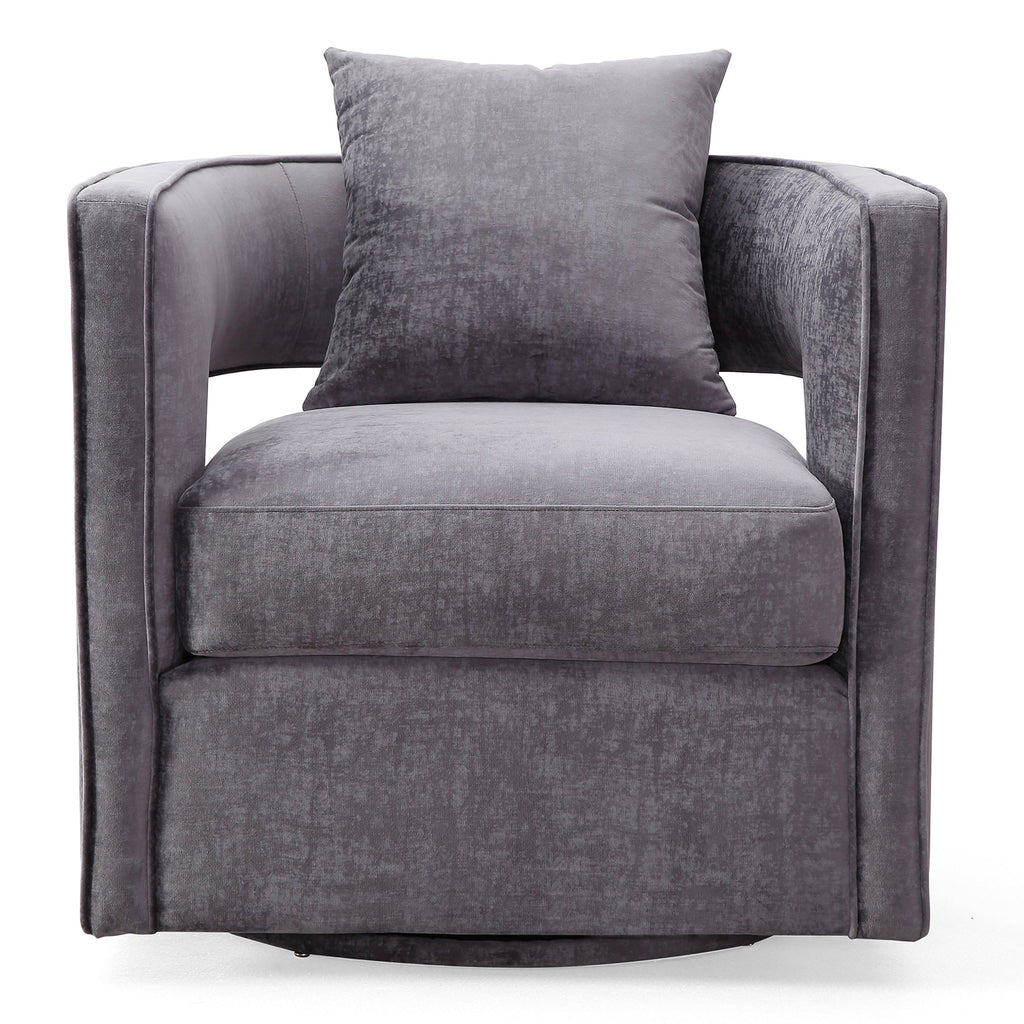 The minimalistic Kennedy swivel chair is versatile and stylish. A comfortable foam fill makes it as plush and inviting as it looks, while the solid wood frame and stainless steel legs set a sturdy foundation. This eye-catching chair will add a pop of style to any space. Available in several sumptuous velvet color options.
