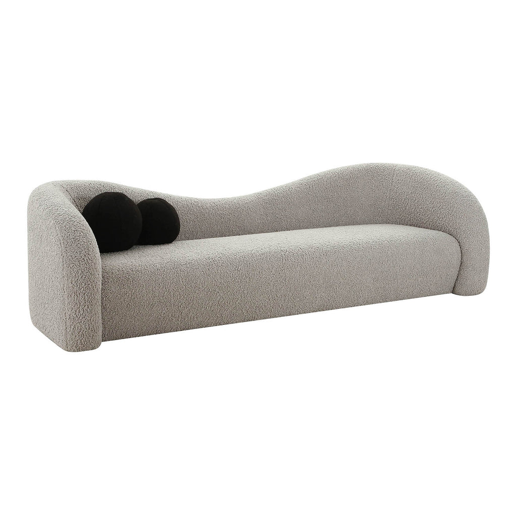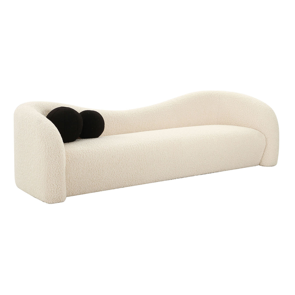 Plush and perfect for relaxing in style, meet the alluring Leonie sofa. This piece is upholstered in faux shearling for a textural element and ultimate comfort, it boasts elegantly sloped back and arms, making it perfect for sinking into. It features 2 rounded pillows in differing sizes for an additional playful touch!