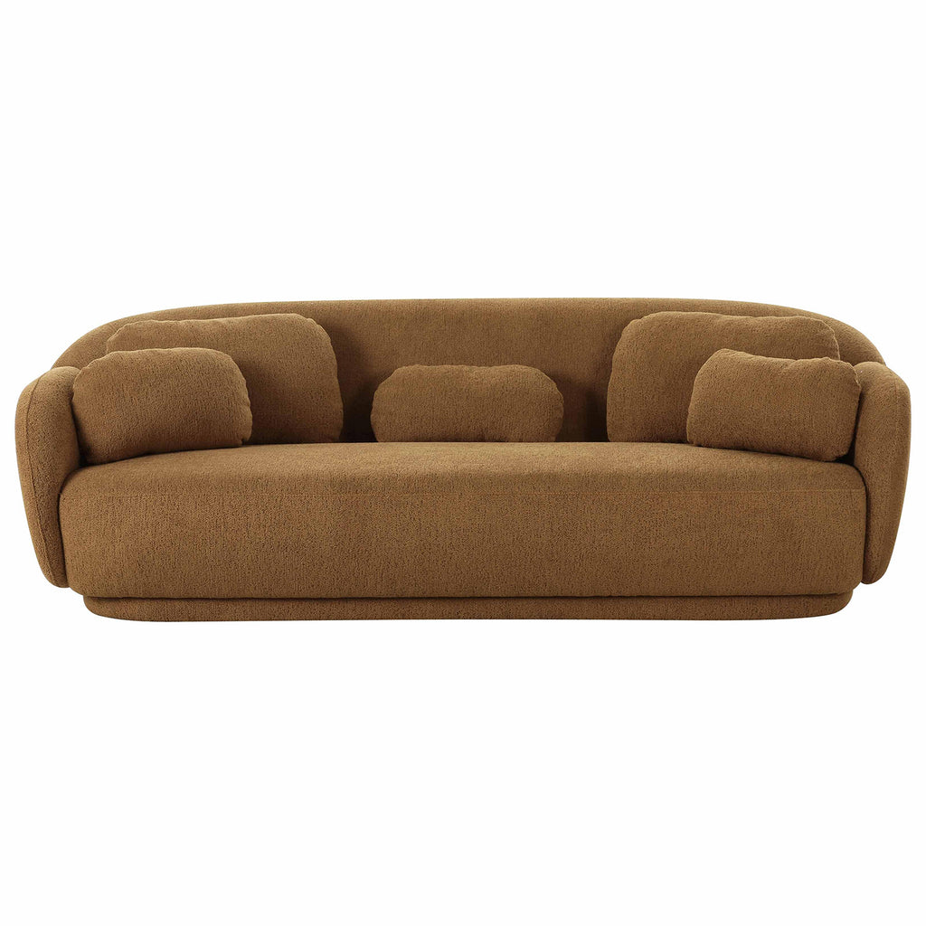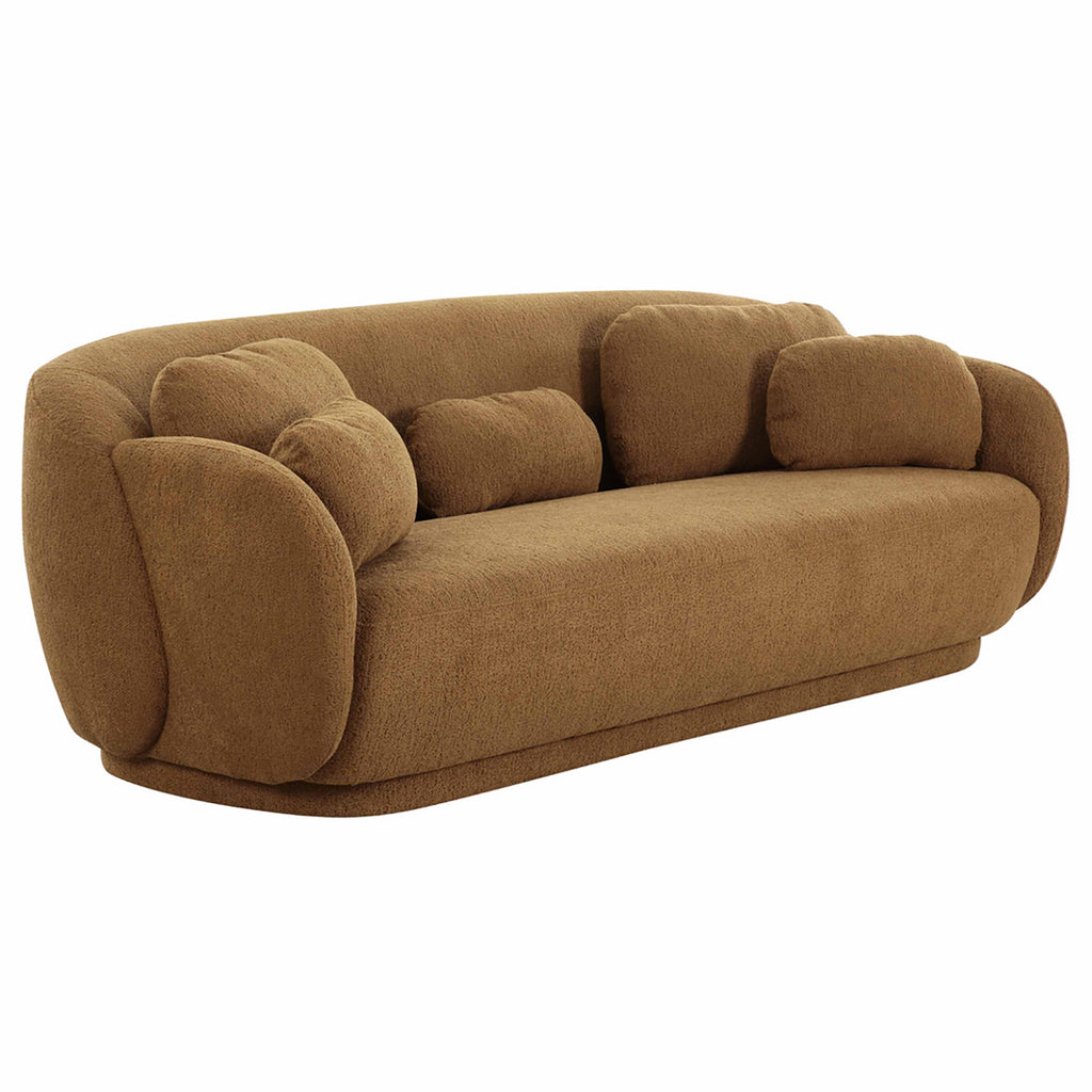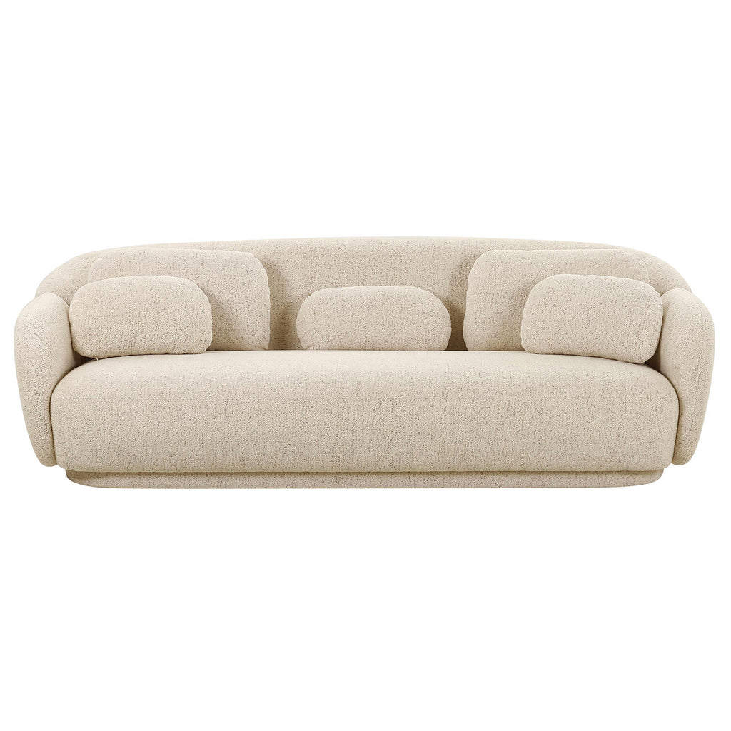 Introducing TOV Furniture Misty: This textural set, sofa and accent chair, is a welcome addition to any home. It doesn't get cozier than this mid-century inspired design, topped with coordinating pill-shaped pillows and upholstered in a delicious cream or brown boucle!