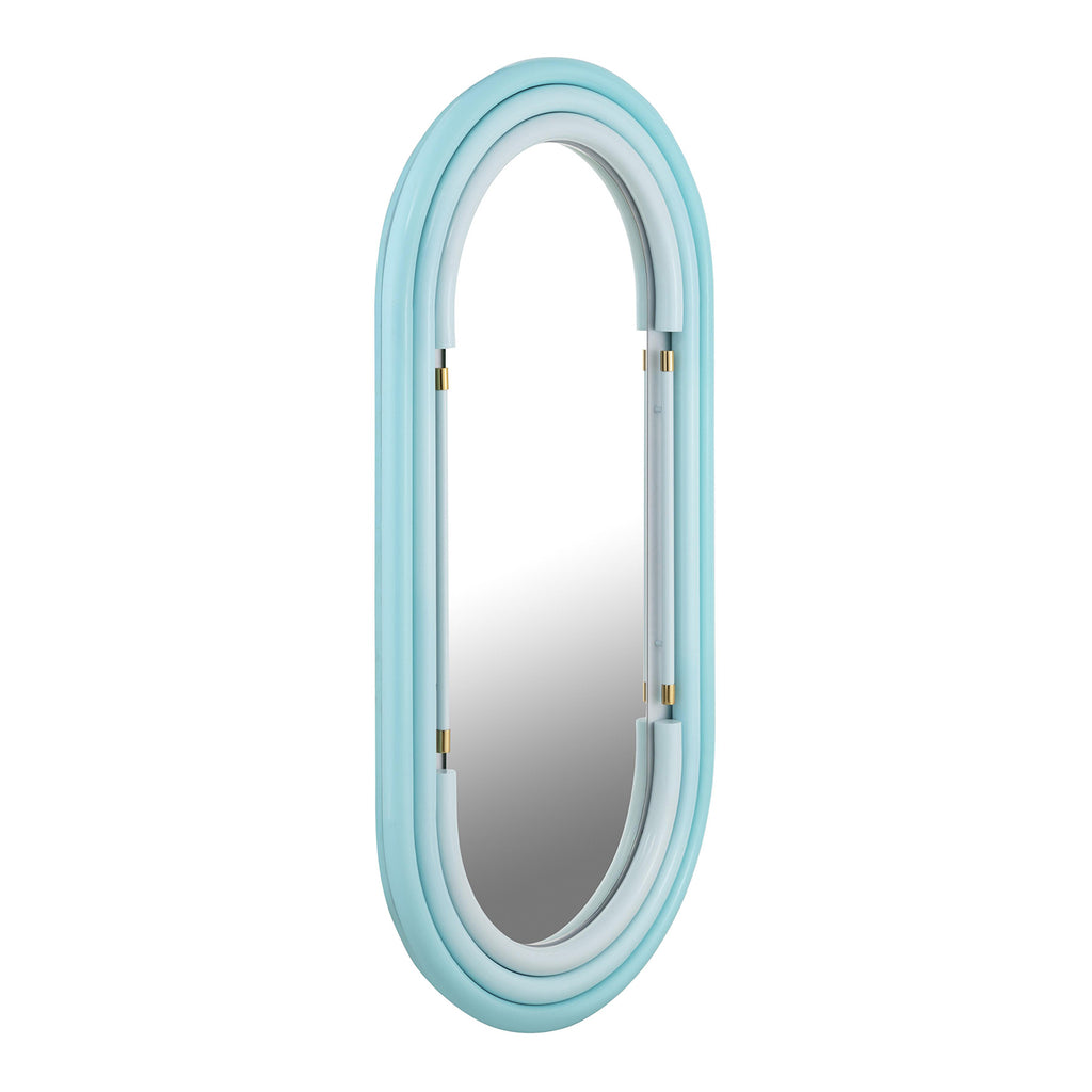 Introducing the Neon Mirror - the perfect combination of style and fun. Crafted from wood with gold iron accents, different shades of blue add dimensions to the otherwise minimalistic frame. This mirror is available as a wall mirror or as a floor mirror, and it will undoubtedly add a pop to your room!